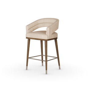 Upholstered in a soft, neutral fabric, the Ava Bar Chair offers a plush seating experience that invites relaxation. The chair features a gracefully curved backrest, providing excellent support and an inviting aesthetic. The warm, walnut-finished legs add a touch of natural charm, while metal accents at the feet provide a subtle hint of modern flair.