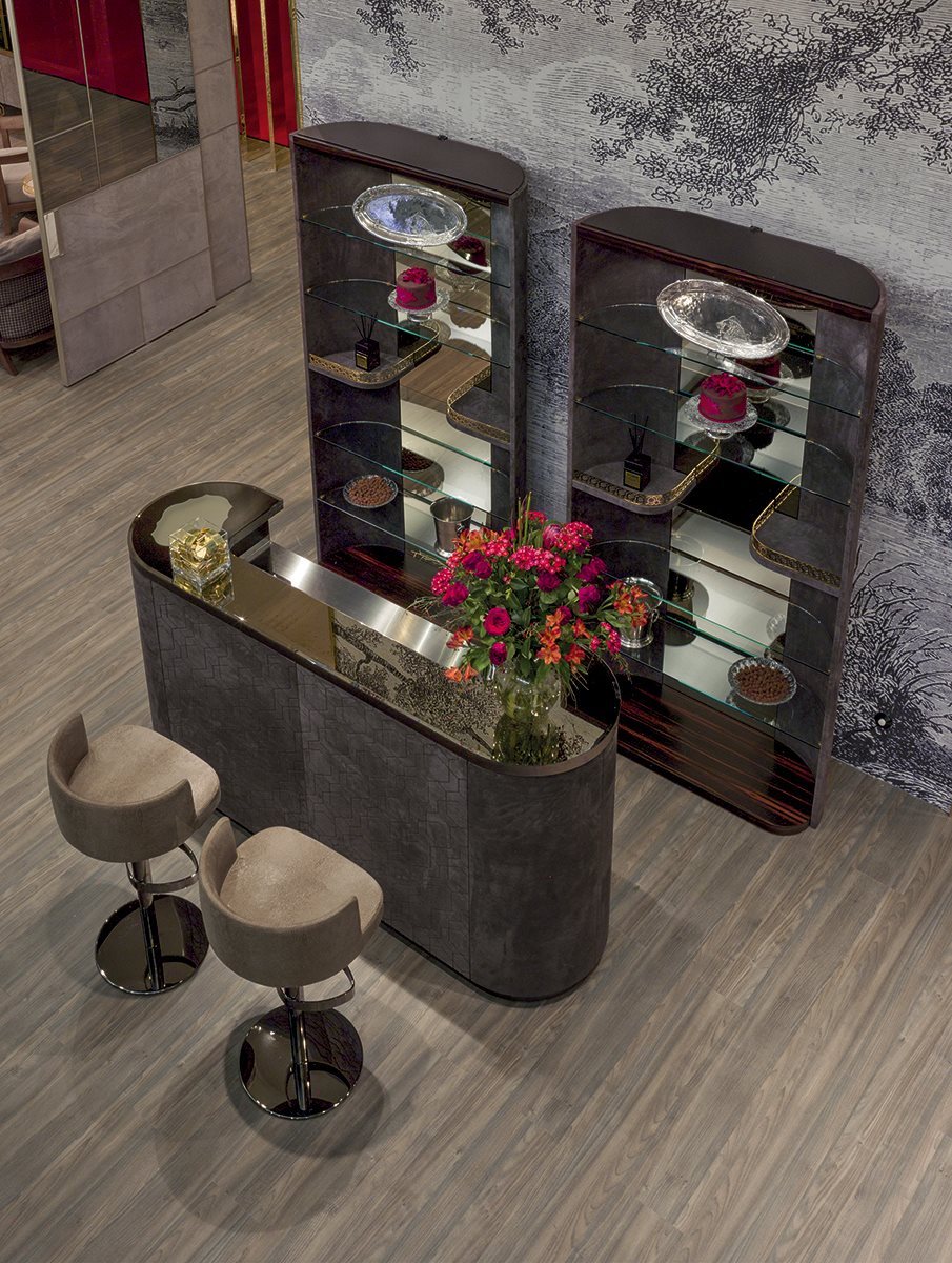 Bar unit with top in satin steel, with basin and taps. The top is also available without accessories. Shaped upper top with bronze or smoky mirror 5 mm with bevel. On request, it is possible to insert a led light with frosted glass diffuser. The cabinet frame is covered in leather or cashmere from the Loro Piana Interiors catalogue, but only the front part can be covered in leather from the P.3 Suede ranges finished with 3D effect leather with “Diamond” or “Sequence” decor. The internal finish of the cabinet with doors in ebony and dark stained zebrano wood, and the cabinet with doors in Canaletto walnut has the internal finish in Canaletto walnut. Ground metal edges in the following finishes: Satin nickel, bright shaded brown, Black Rose gold, bright light gold, matt Champagne gold, bright chrome, bright black chrome, matt satin bronze, bright pink gold, matt pink gold. On request, a mini wine refrigerator is available.