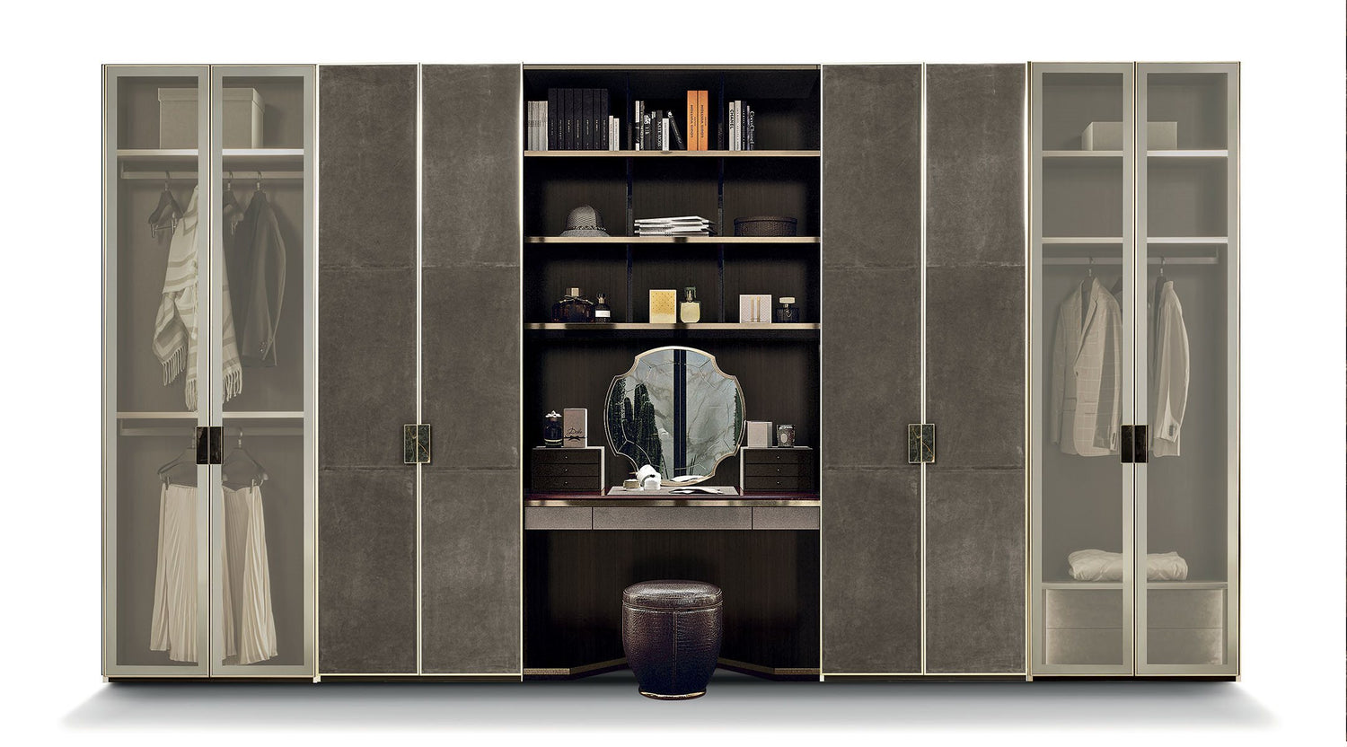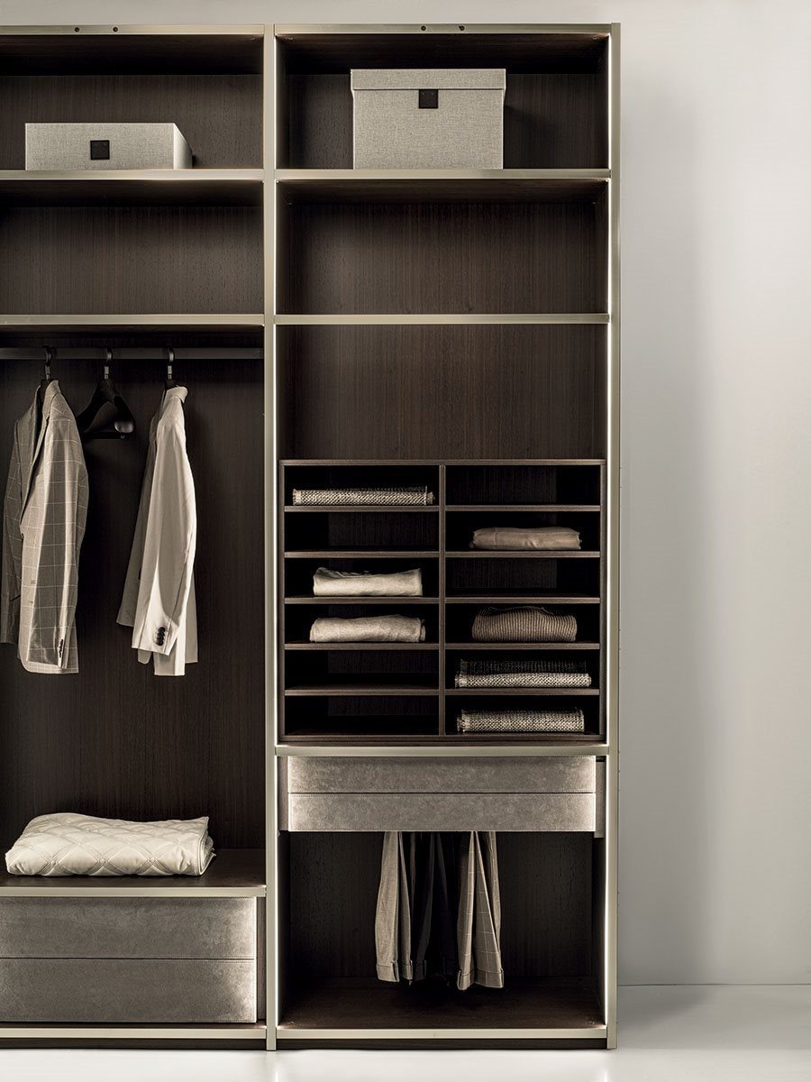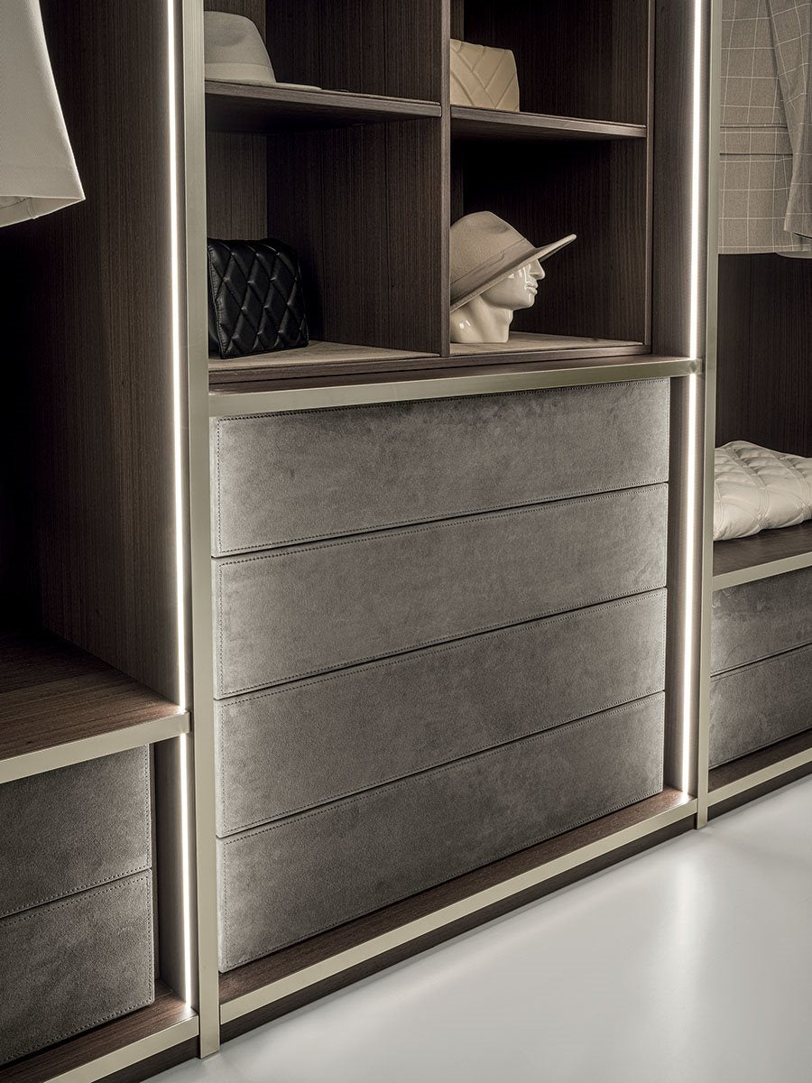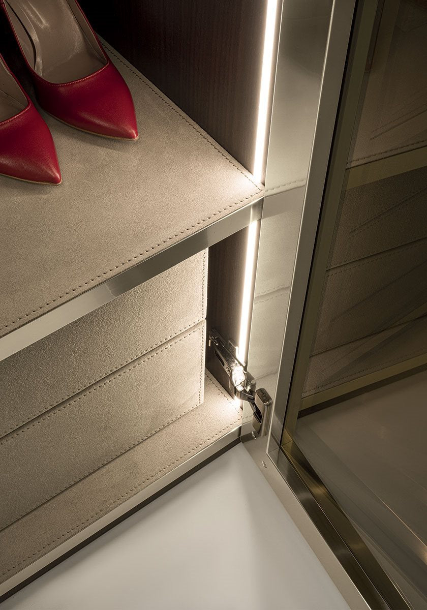 The versatile modular system Atelier merges into a luxurious and all-embracing environment that is ever modern and can never be taken for granted. Edge of the line organisation of interiors with endless customisation options: chest of drawers, valet trays, bag compartments and shirt compartments create a practical and functional wardrobe. Precious elements studied to the last detail, such as mini chest of drawers and mirrors enhance the luxurious features of the composition. Aluminium profiled doors and handles with a marble insert are underscored by exclusive full height LED lighting.