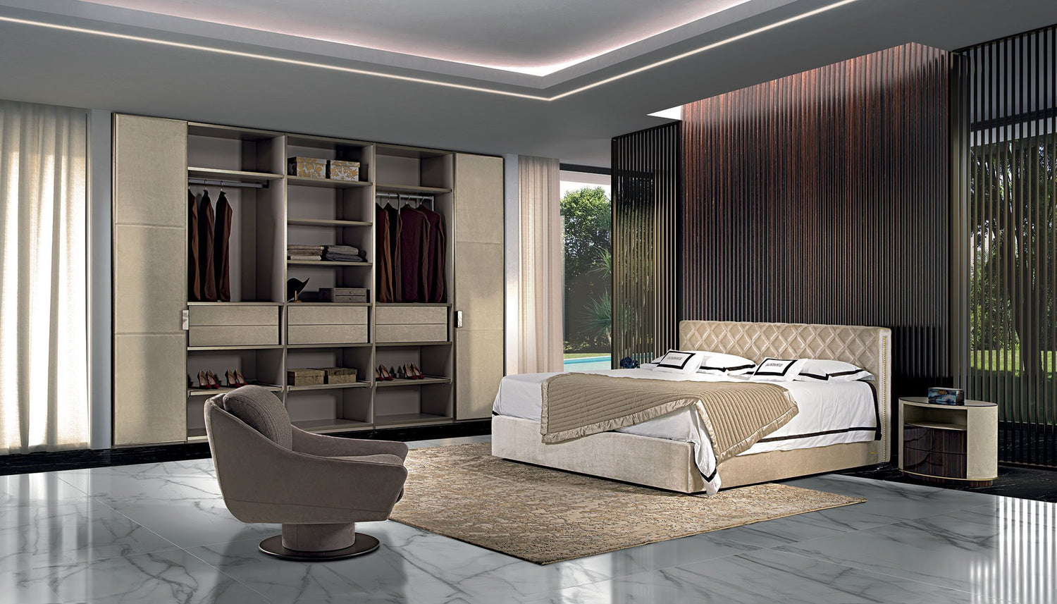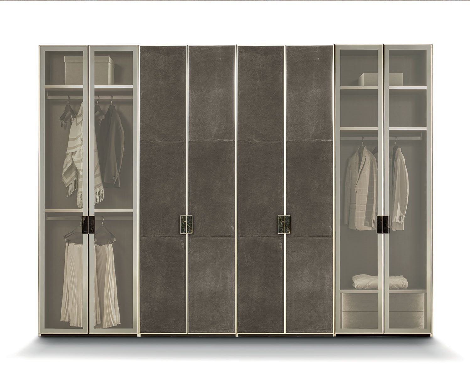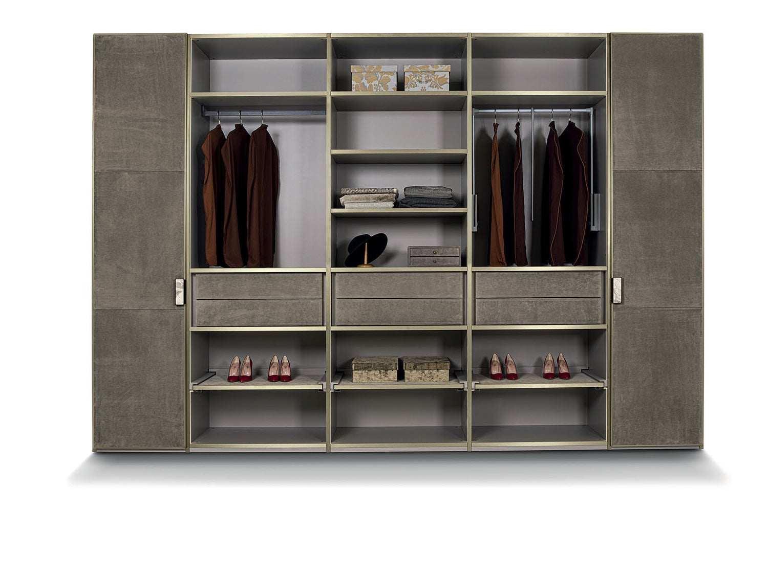 The versatile modular system Atelier merges into a luxurious and all-embracing environment that is ever modern and can never be taken for granted. Edge of the line organisation of interiors with endless customisation options: chest of drawers, valet trays, bag compartments and shirt compartments create a practical and functional wardrobe. Precious elements studied to the last detail, such as mini chest of drawers and mirrors enhance the luxurious features of the composition. Aluminium profiled doors and handles with a marble insert are underscored by exclusive full height LED lighting.