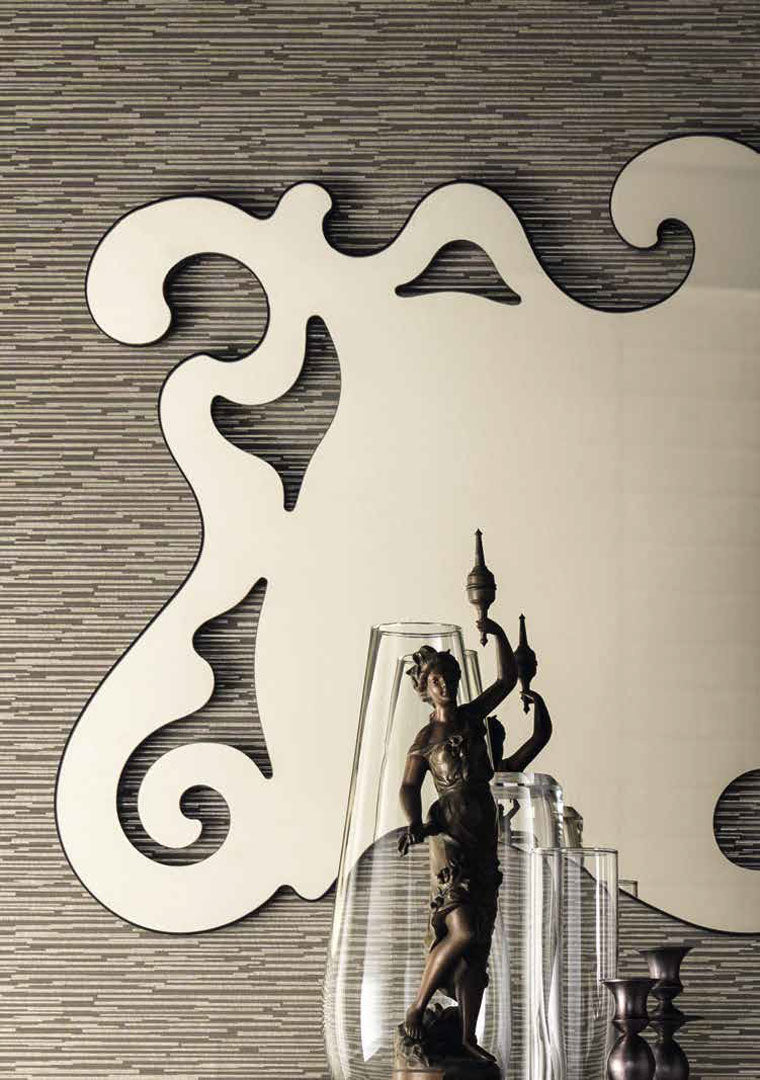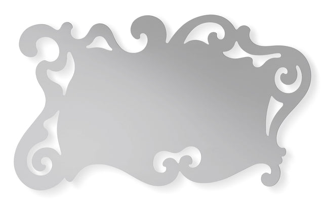 The mirror is water-cut, has a double-layer silver background and its surface is covered with a shaped, strengthening-support panel. A simple graphic sign with classic design which is also suitable for modern settings. It is perfect for placing above a sideboard or chest of drawers, in the living area or bedroom.