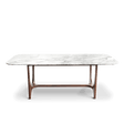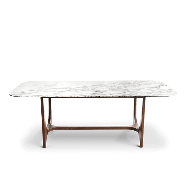 Named after the Italian cinema legend, Alberto Sordi. this dining table, reminiscent of Oscar Niemeyer's architectural shapes, with curvilinear wooden legs that elegantly blend with the round corners of its marble top. A modernist masterpiece, fusing art and design flawlessly.