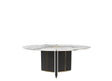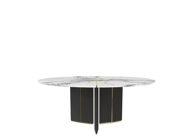 Algerone is an opulent round dining table inspired by architectural elements. It was designed to remind us of the unique strength and class that only marble has. The Carrara marble circular top is supported by a sleek base adorned with black leather and polished brass detailing. A design that will redefine the way you perceive dining tables.