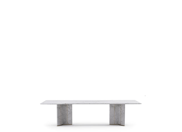 Algerone is an imposing rectangular dining table inspired by sleek architectural elements. This classic piece showcases the strength and classic nature of Statuario marble, which is further enhanced by the presence of meticulously placed brass lines. The intertwinement of these materials makes for quite an alluring decor statement.