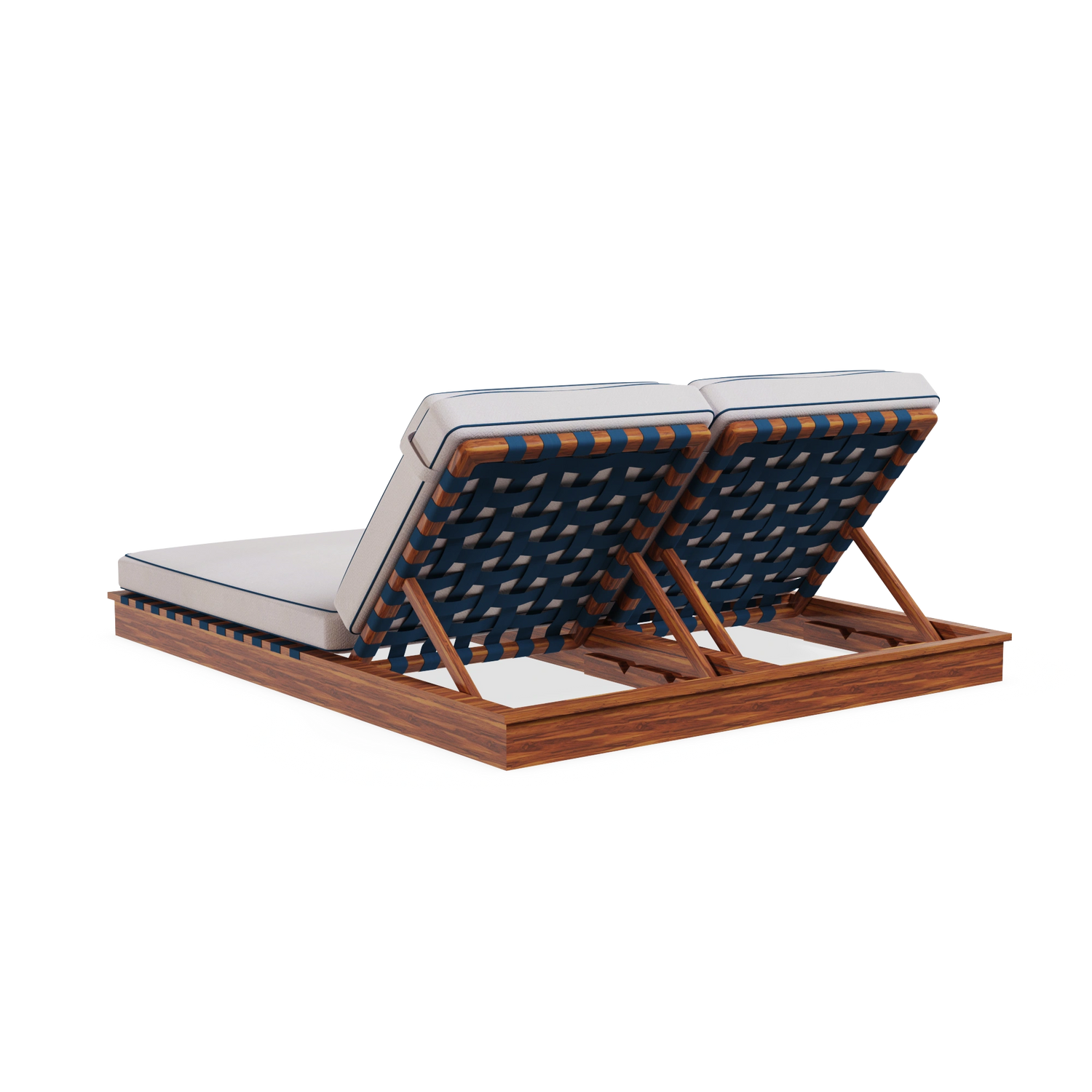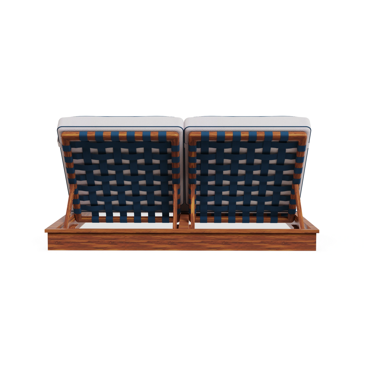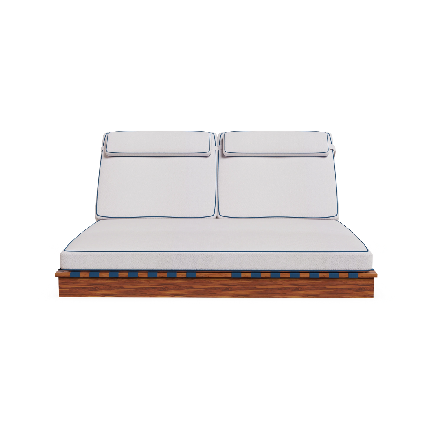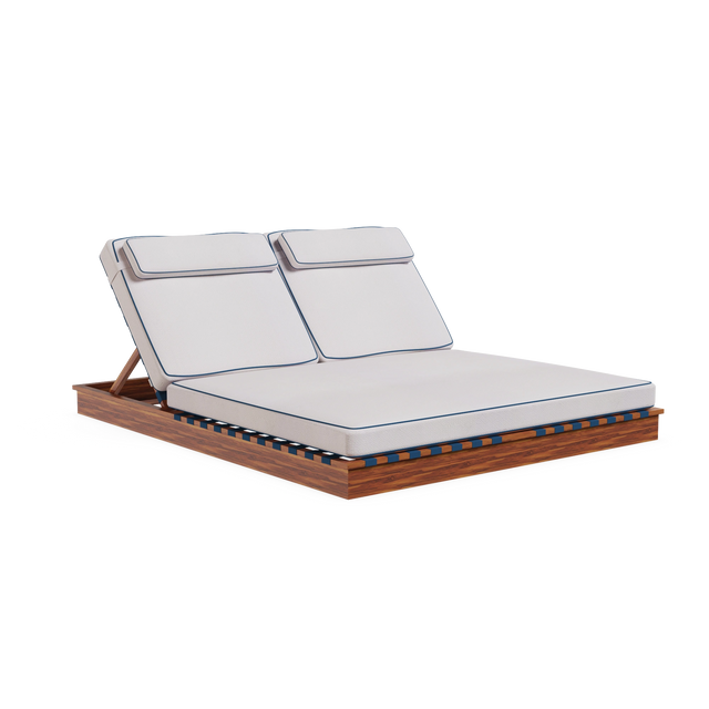 The Altea Sun Lounger embodies the essence of outdoor luxury furniture. Designed for coastal living, double seated, featuring an intertwined synthetic cord backrest, complemented by white cream fabric and elegant blue piping that evokes a serene Mediterranean aesthetic.