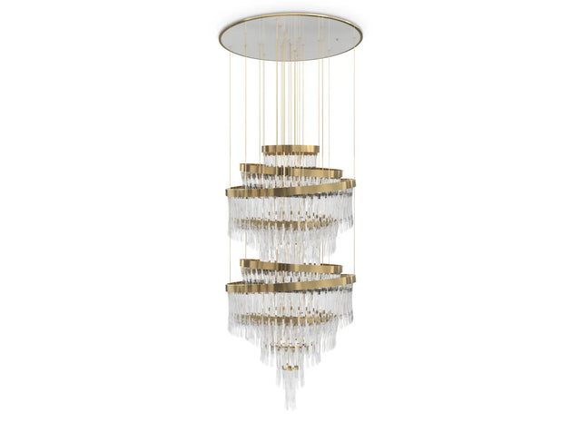 Described as a masterpiece of design, the Babel Chandelier XL is the perfect centerpiece that will illuminate every setting perfectly. Shaped with a downfall of handmade crystal glass and gold-plated brass, it creates exclusive patterns of lighting reflecting on the surroundings.