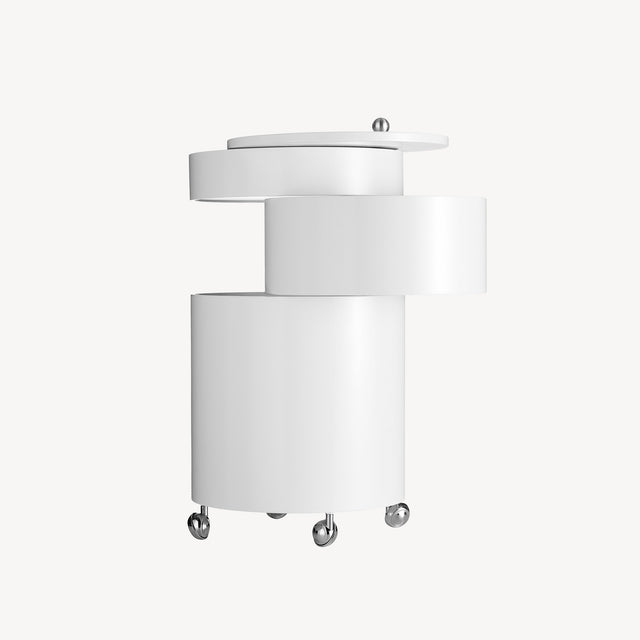 Adaptable side table and mobile storage unit in one. Barboy consists of three round-shaped drawers, which can be pulled out fully so the whole surface can be used. Barboy is a typical example of Panton’s furniture, in which he combines a matt surface with a shiny chrome handle and wheels, investing the piece with an elegant contrast.
