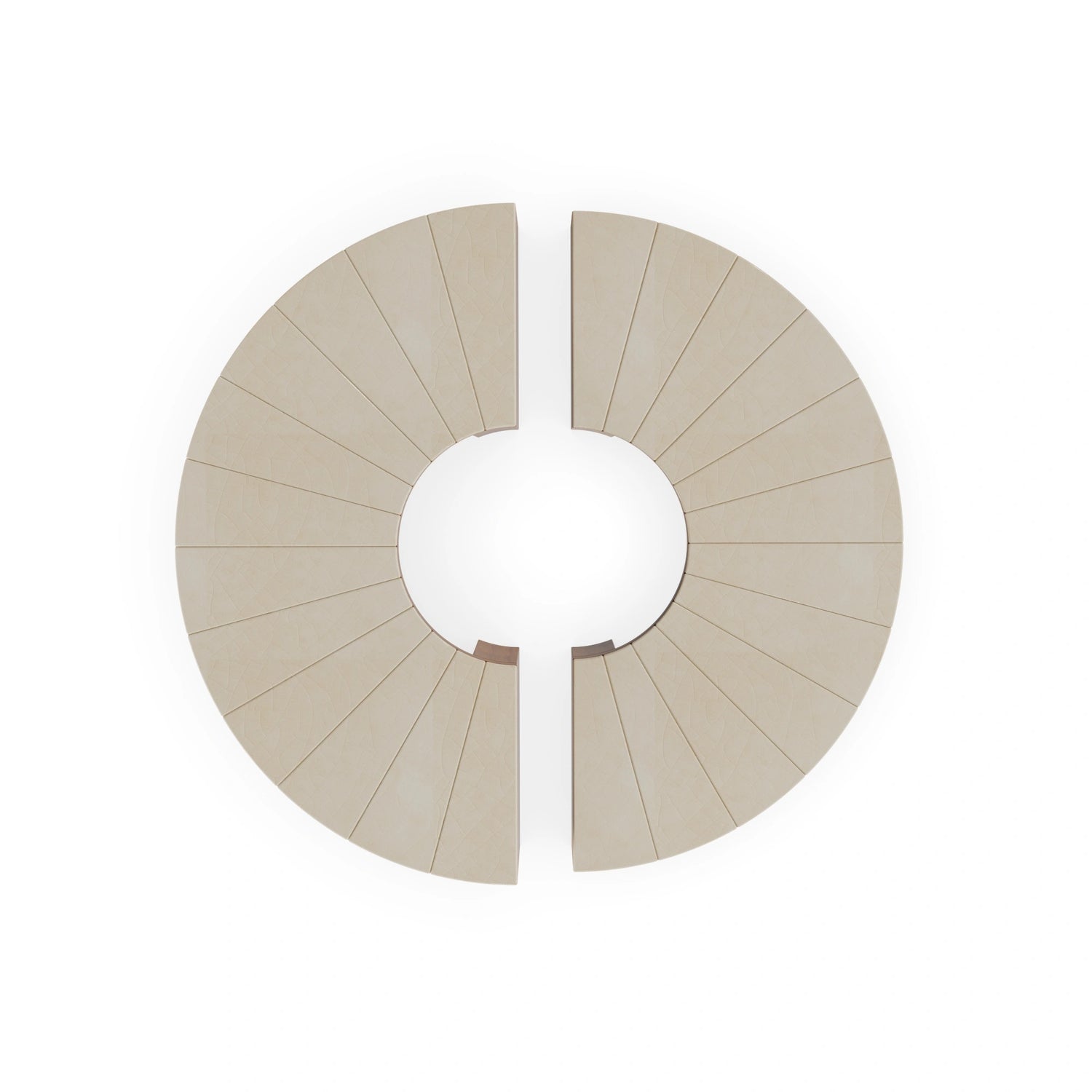 Its modular circular design, handcrafted in iroko wood with a ceramic top, celebrates natural textures and artisanal precision, evoking the timeless beauty of Mediterranean outdoor living.