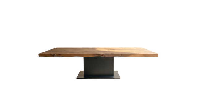 Indoor dining table, crafted with reclaimed oak beams and steel.