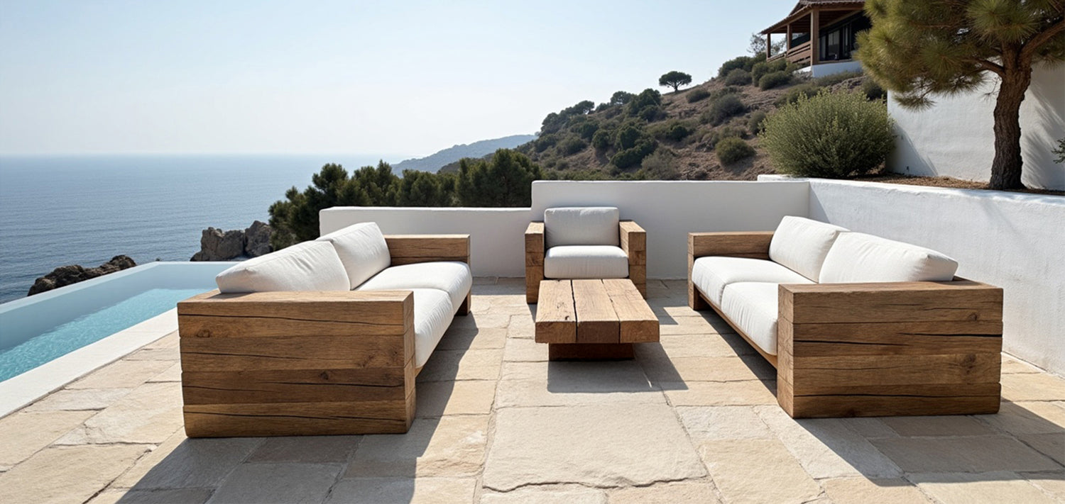 Two, three or four-seater indoor sofa crafted with reclaimed oak beams.