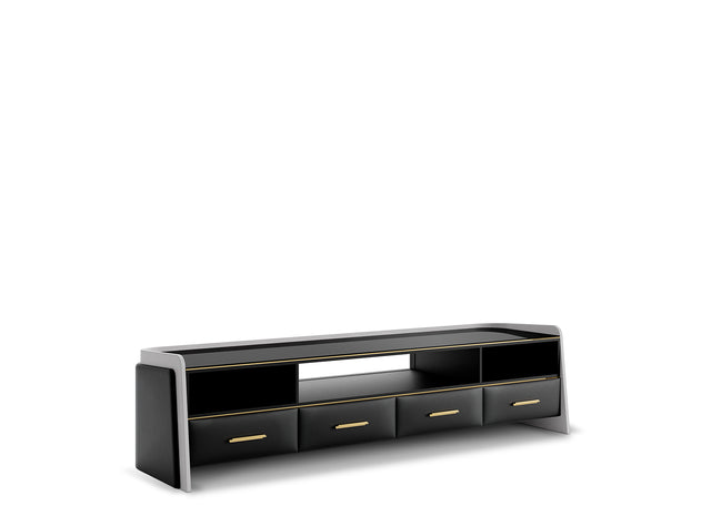 The Charla TV cabinet becomes the new essential classic for your living room. Functional and sophisticated, this supportive piece offers plenty of storage room, with four drawers upholstered in beige Nata leather, and grey leather adds a lavish touch to its back and lateral surfaces. Charla is a tasteful and daring piece with a modern identity!