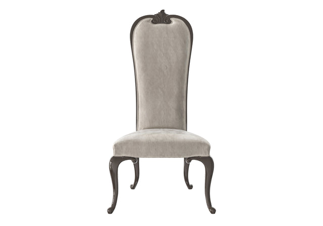 A timeless design by Modenese Luxury Furniture featuring a high backrest and gracefully curved dark wooden legs. The soft fabric upholstery adds a refined touch, perfect for formal dining or sophisticated living spaces.