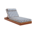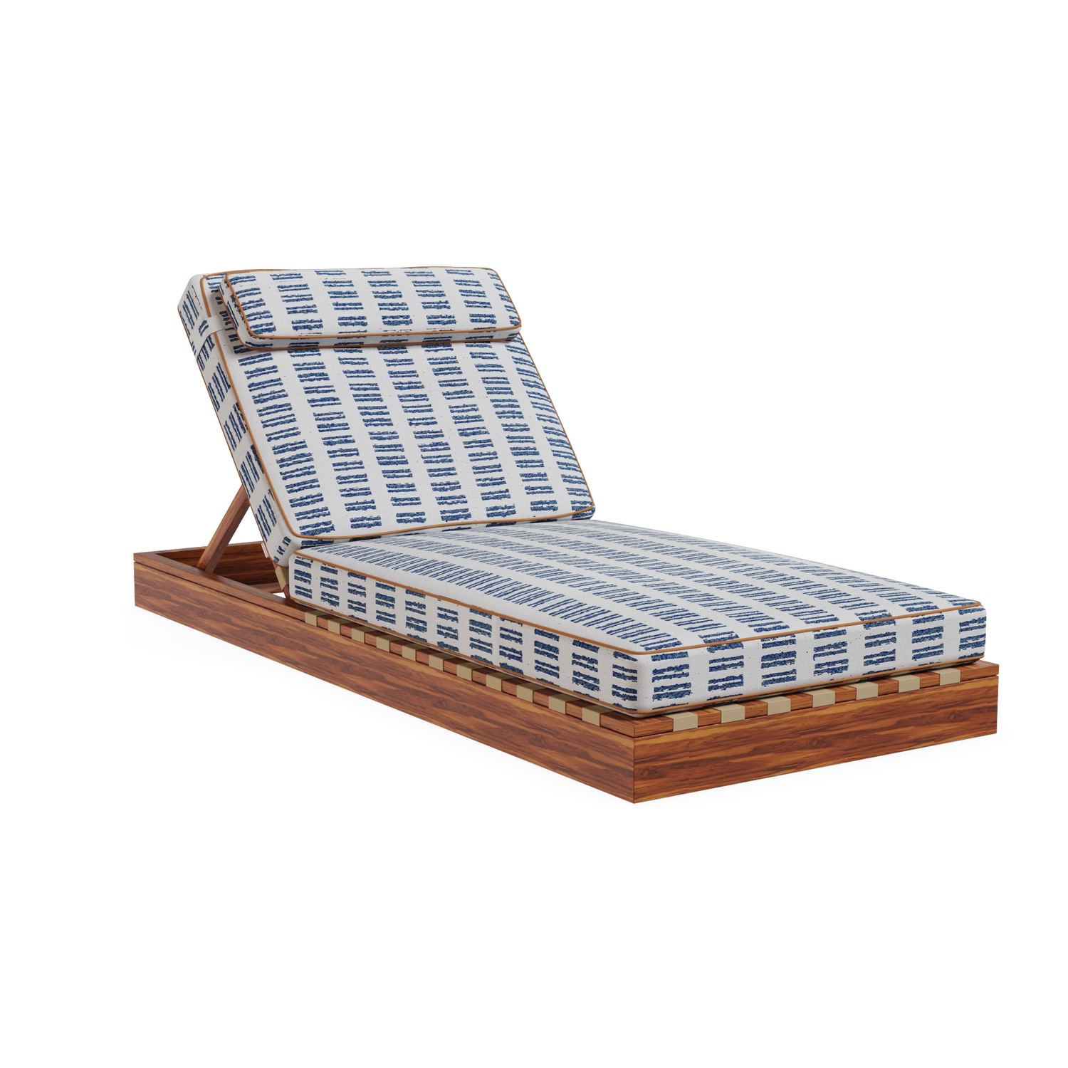The Corsica Sun Lounger is carefully hand-crafted in iroko wood, this piece is designed to withstand outdoor living while offering timeless elegance. Its adjustable back, finished in durable synthetic leather, ensures the perfect inclination for ultimate comfort. The generously padded seat and back cushions, dressed in a Mediterranean-inspired patterned fabric with delicate piping detail, elevate the design with sophistication.