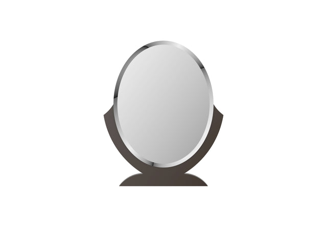 An elegant freestanding oval mirror by Modenese Luxury Furniture with a bold dark frame that adds sophistication to any space. The sleek base ensures stability while maintaining a chic aesthetic. Perfect for use on vanities or toilettes, this mirror combines style and utility in equal measure.