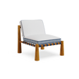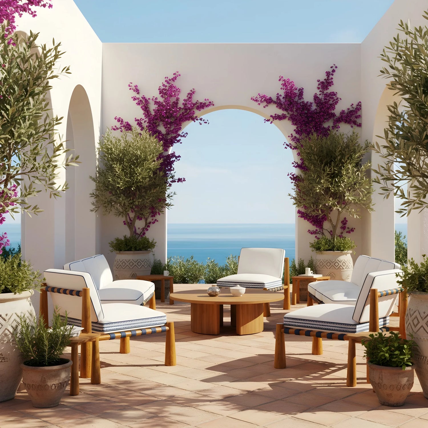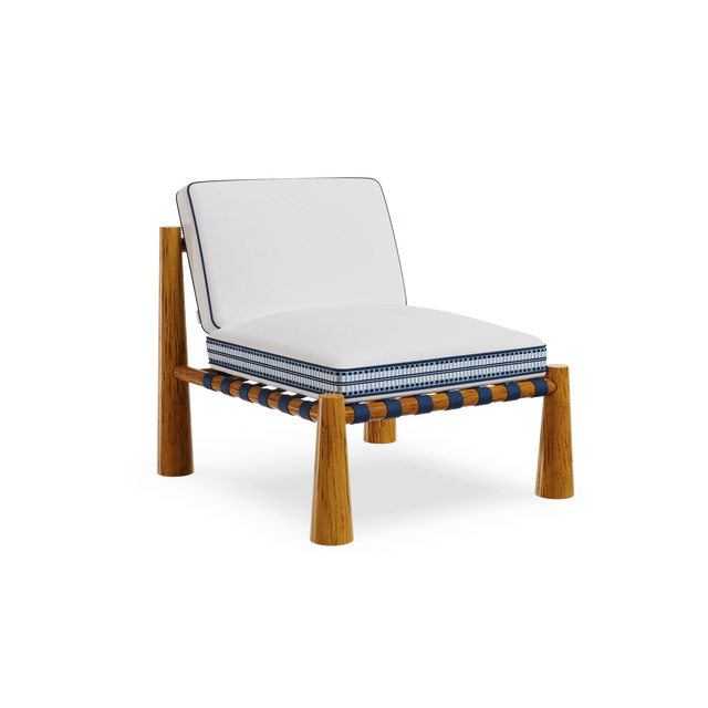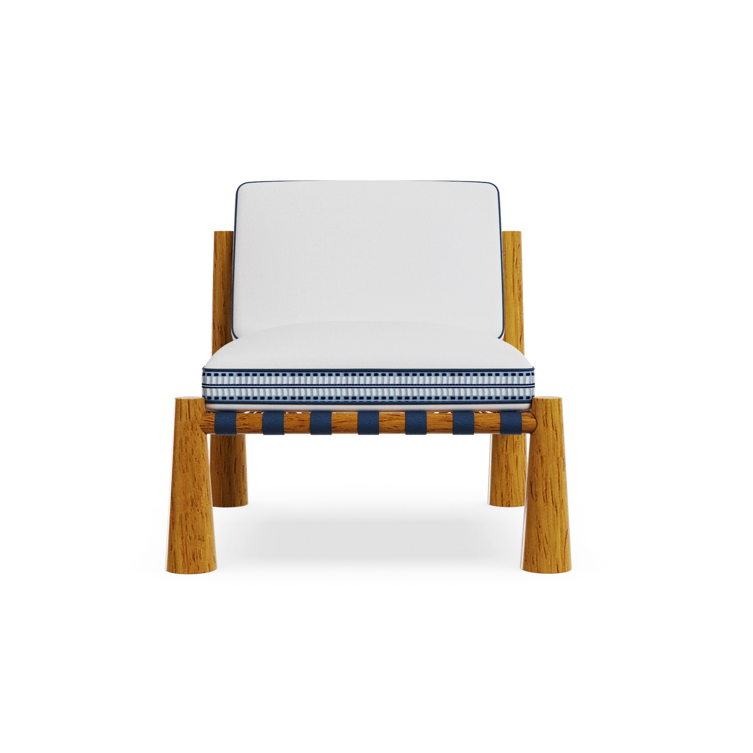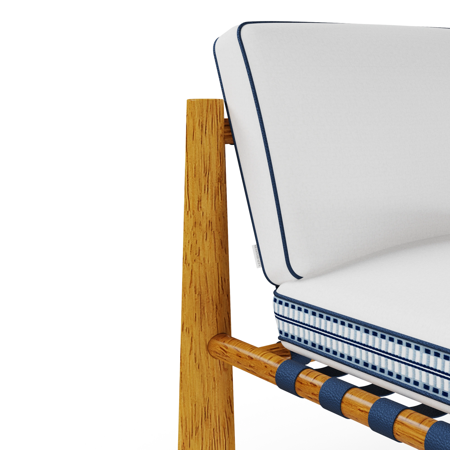 Inspired by Mediterranean craftsmanship, the Deià Armchair combines natural beauty with refined comfort. Its structure is crafted from rich iroko wood, complemented by elegant leather cord details that enhance its artisanal character. The seat cushion is elevated with a distinctive patterned tape finish, while the subtly inclined backrest ensures exceptional comfort for long moments of relaxation.