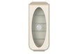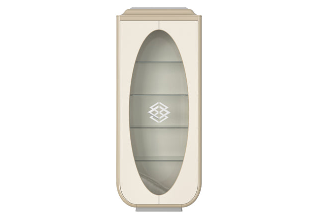 A stylish double-door cabinet with an elongated oval glass panel by Modenese Luxury Furniture. Its compact design and neutral tones make it perfect for adding elegance and functionality to smaller spaces, ideal for displaying decorative items or fine tableware.