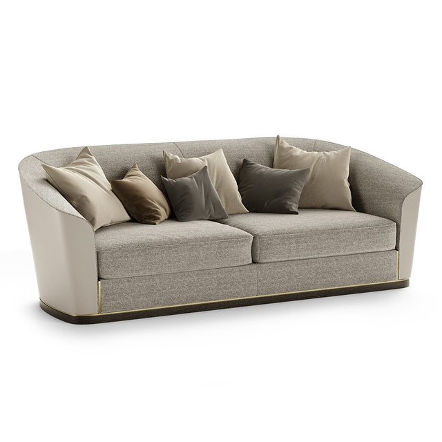 Elegant curves combined with a timeless expression, the Draper sofa exhibits a sinuous upholstered silhouette with sloping armrests, counterbalanced with a robust wood structure, supporting the body weight, and fine brass lines outlining it.