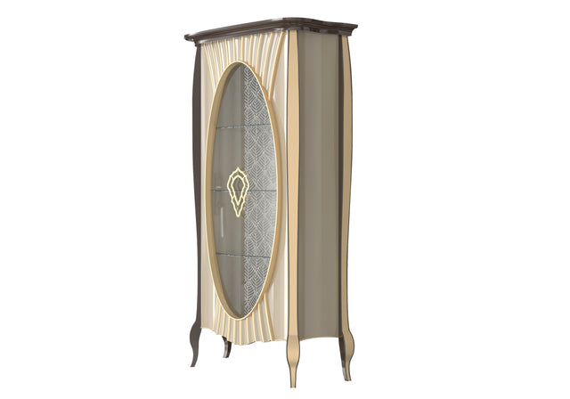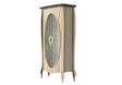 A refined tall cabinet by Modenese Luxury Furniture featuring an oval glass front with intricate patterns and a fluted wooden frame. Its dark top and delicately curved legs add a touch of vintage sophistication, ideal for showcasing your finest items in a luxurious living space.