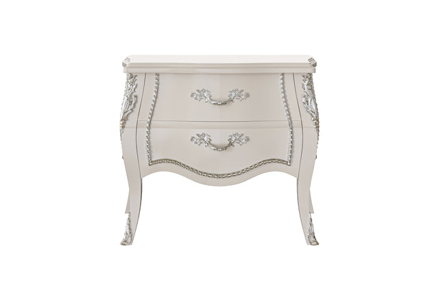 This refined nightstand by Modenese Luxury Furniture showcases delicate carvings on its curved frame and ornate handles. The white glossy finish and sculptural legs create a sophisticated look, perfect for enhancing classic or transitional interiors.