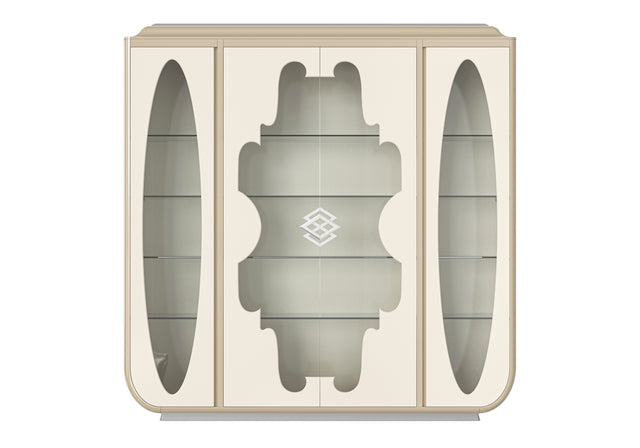 A sophisticated display cabinet by Modenese Luxury Furniture featuring curved glass panels and a central decorative motif. The spacious shelving offers ample room for showcasing your finest items, while the neutral finish complements both classic and modern interiors.