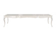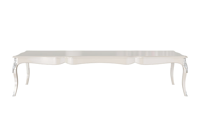 A grand rectangular dining table in a white glossy finish by Modenese Luxury Furniture, adorned with intricate carved details on the corners and gently curved edges. The elongated design and elegant cabriole legs make it perfect for hosting large gatherings in refined dining spaces.