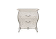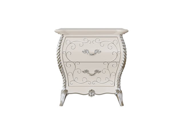 An exquisite nightstand with intricately carved floral patterns and a softly curved silhouette by Modenese Luxury Furniture. The soft finish and sculpted legs add a timeless elegance, making it a beautiful addition to traditional or vintage-inspired bedrooms.