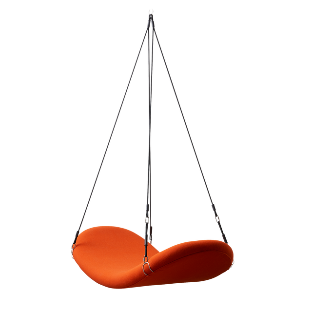The fully upholstered Flying Chair is suspended from the ceiling on both sides using nylon ropes, making it possible to adjust the height and seating position. The eccentric design allows one to create various situational and mood-evoking environments and create unique experiences on several levels.