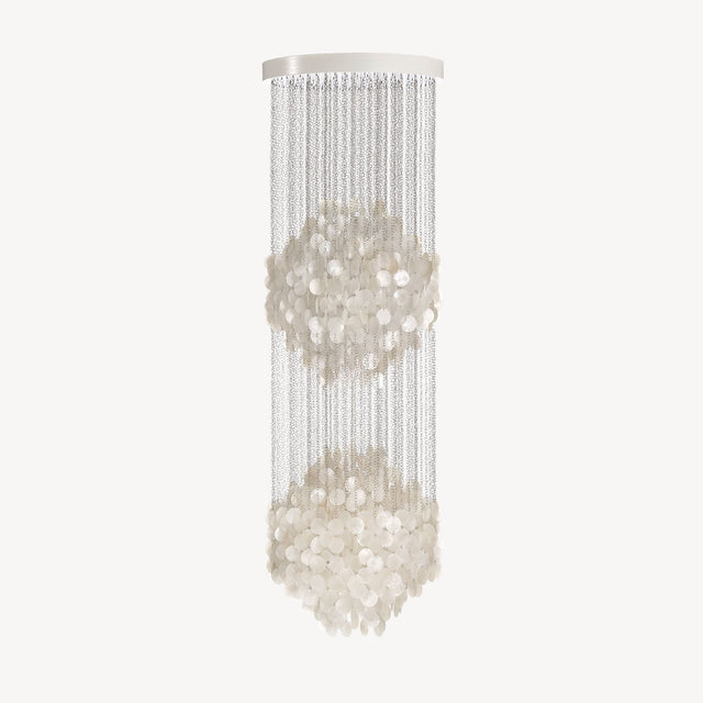 Seashell discsStainless steel ringsCeiling plate is made of MDF (white lacquered).Transparent plastic cord.