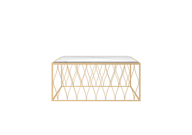 This luxurious rectangular coffee table by Modenese Luxury Furniture features an elegant geometric metal frame with a striking design that adds a modern touch to any room. The pristine marble top perfectly complements the sophisticated golden accents, offering a refined and timeless centerpiece for your living space.