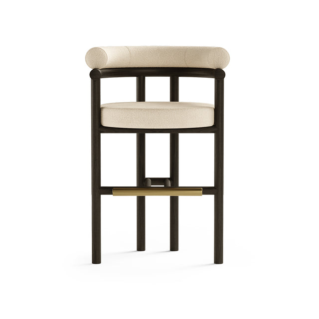 The Hudson Bar Chair was designed to focus on minimalistic design, comfort, and timeless aesthetics. It has four sturdy wooden legs with a natural finish, and the seat has a rounded, upholstered base, offering a comfortable and minimalist design. The backrest is elegantly curved, complementing the chair's rounded seat, and includes a cylindrical back pillow for added lumbar support and a touch of softness.