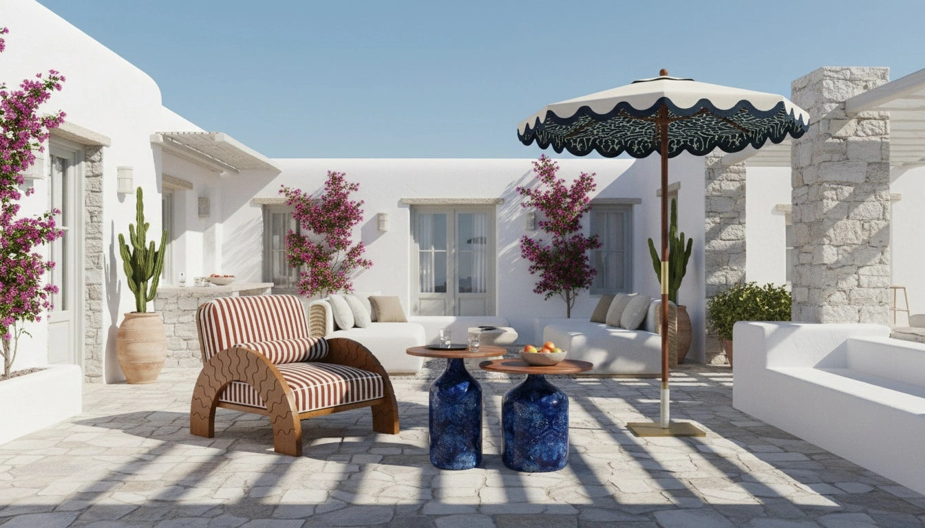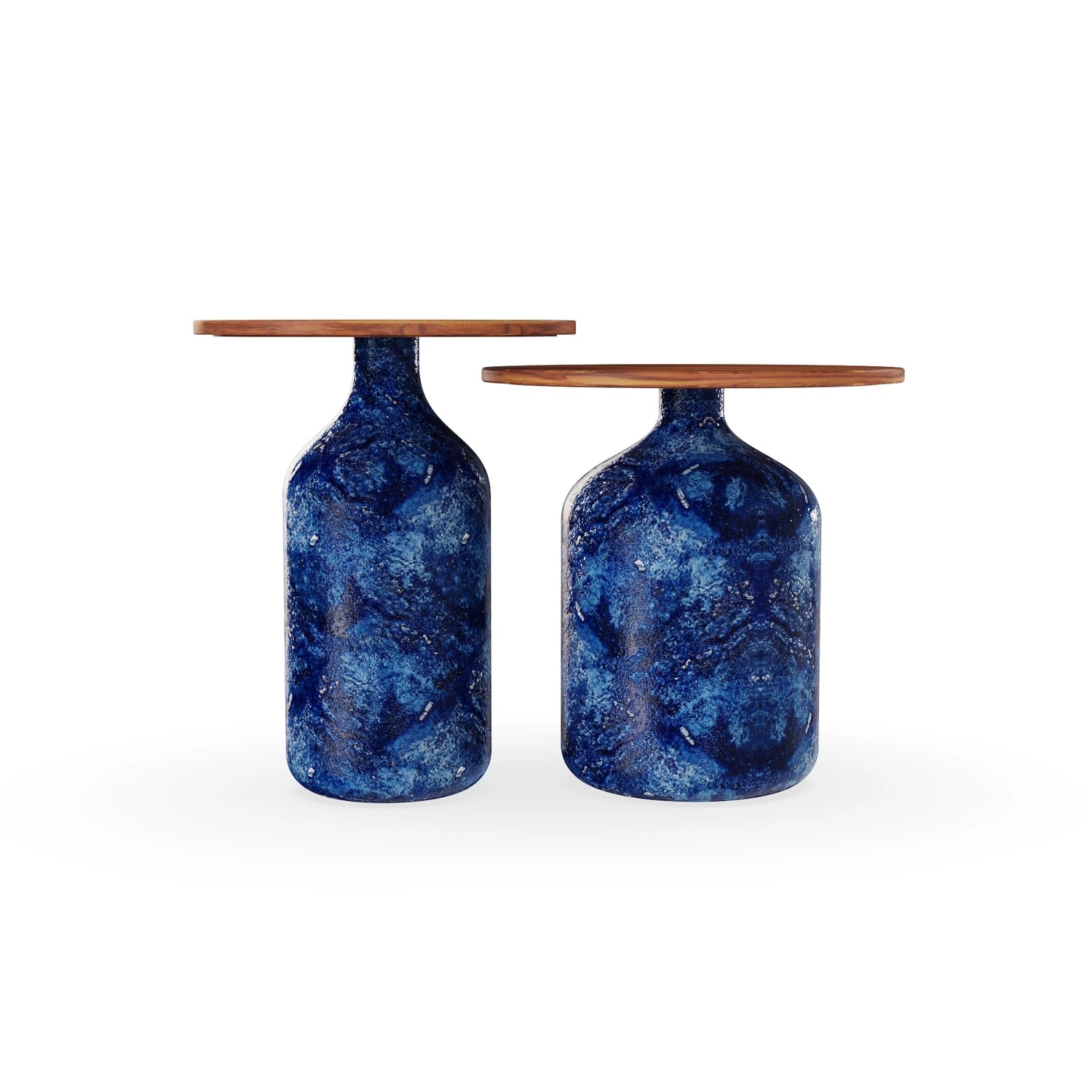 The Jávea Modular Side Table celebrates Mediterranean craftsmanship in every detail. Handcrafted in iroko wood, the top is designed to withstand outdoor living while adding timeless elegance. Its sculptural base, crafted in glazed ceramic with deep blue tones, evokes the textures and colors of the sea, creating a striking contrast with the warm wooden surface.
