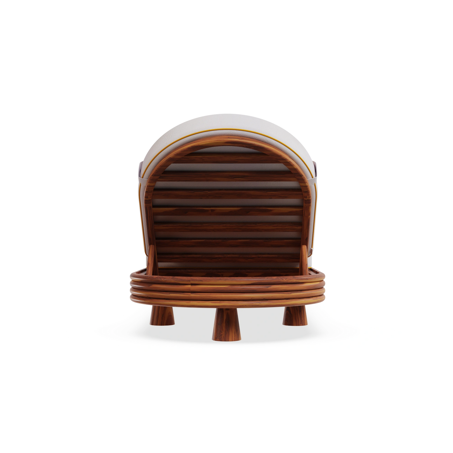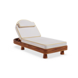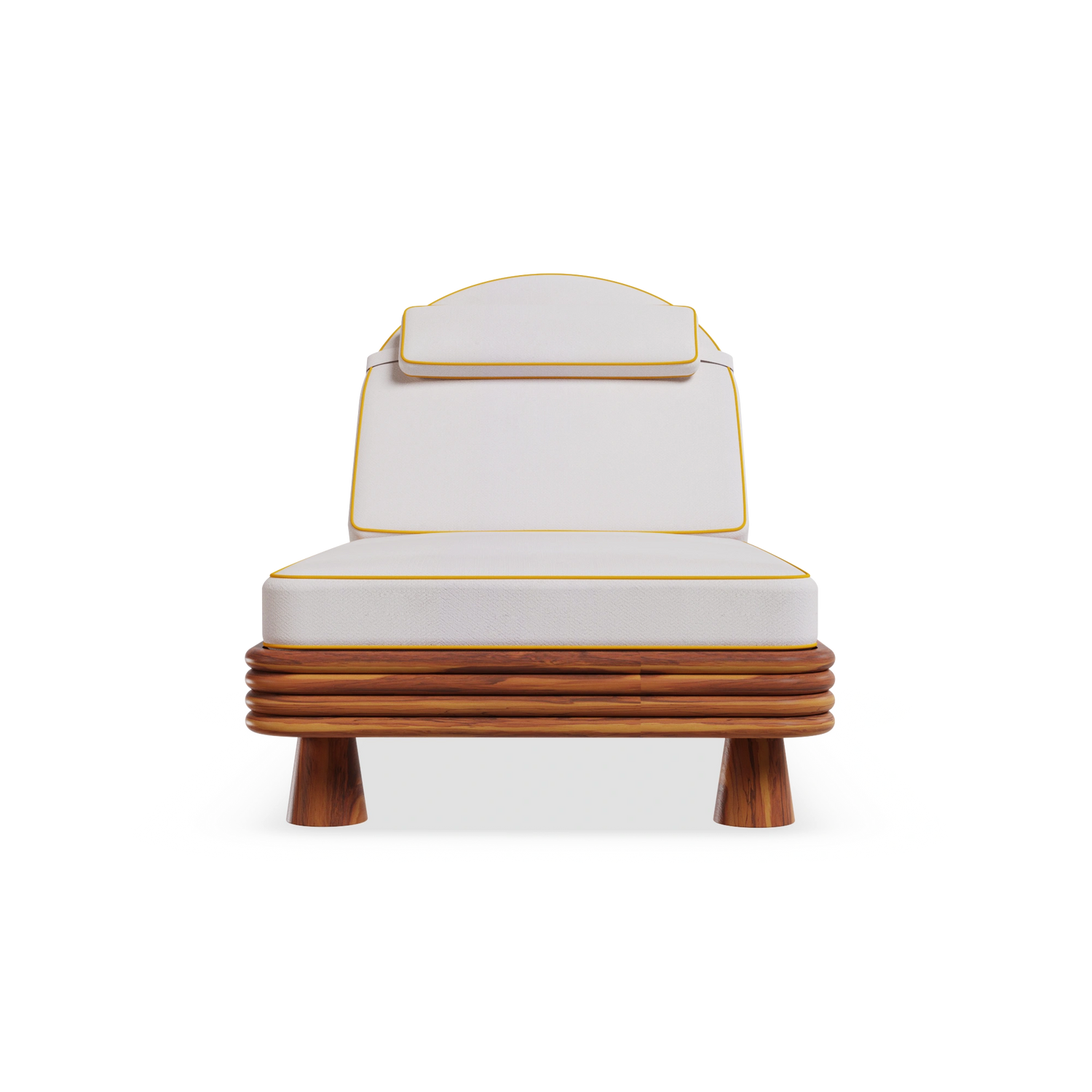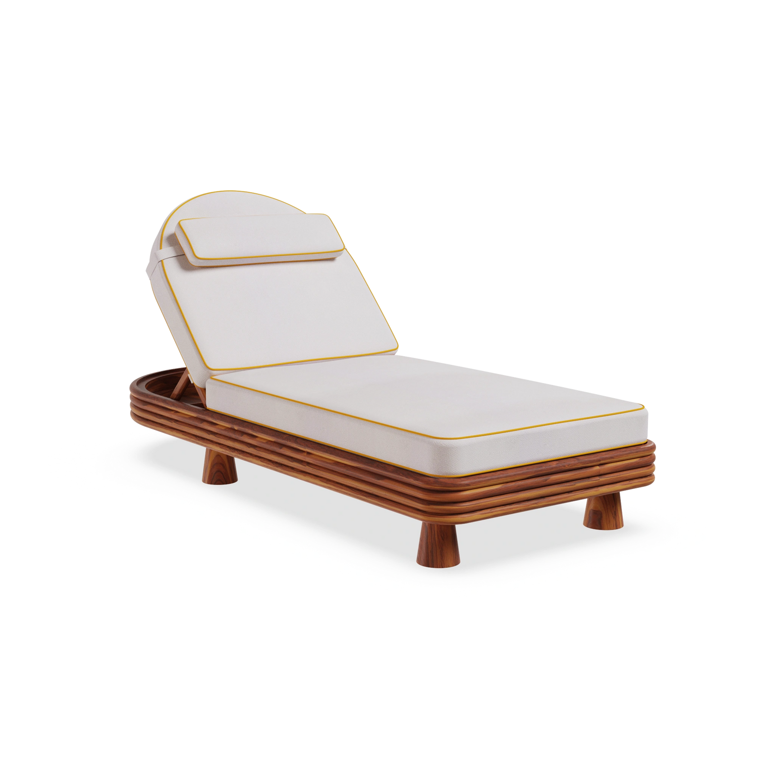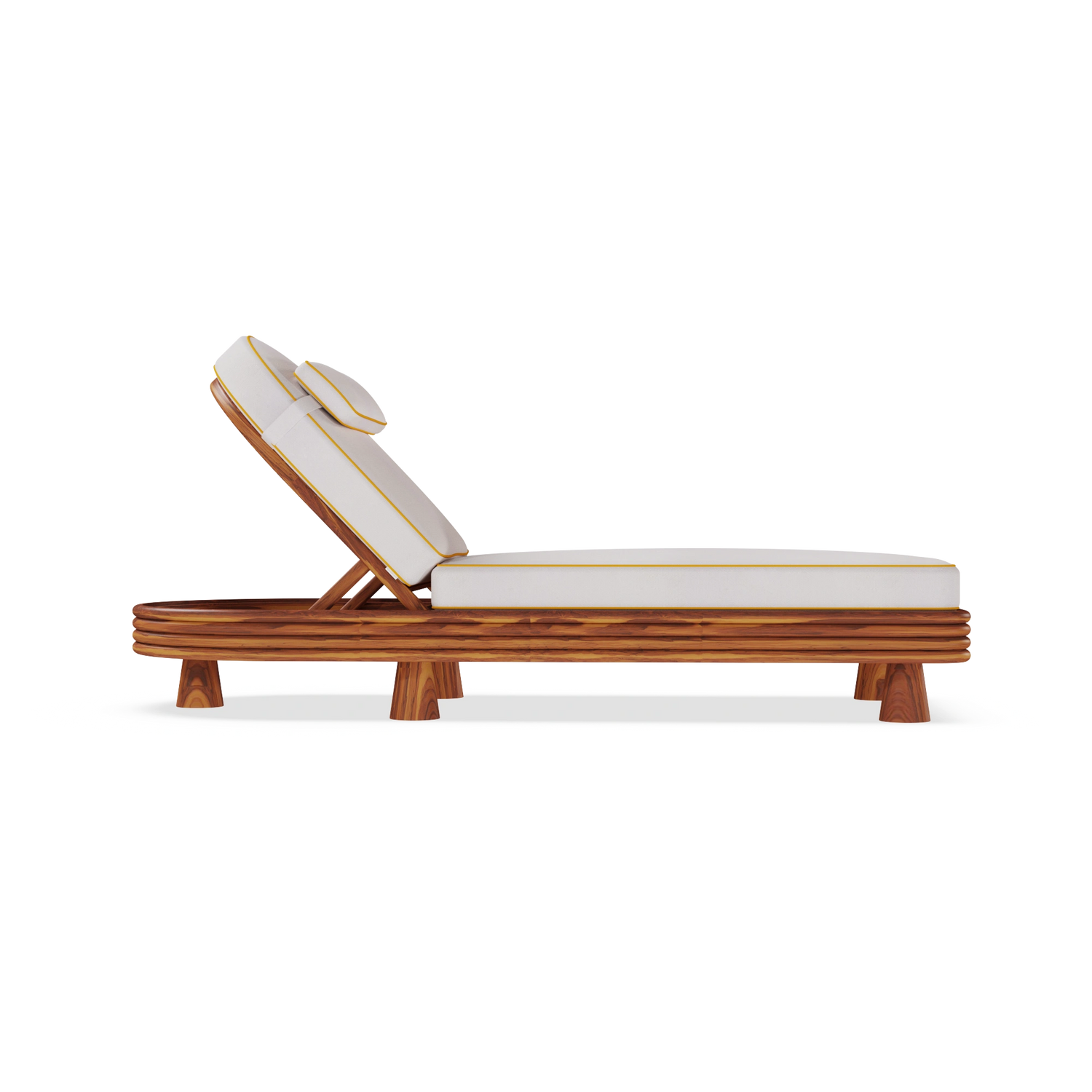 The Jondal Sun Lounger is carefully handcrafted in premium iroko wood for lasting beauty and durability. Its ribbed base introduces a bohemian elegance, while sculptural conical feet add a contemporary touch. The seat and back cushions, finished with delicate piping detail, enhance both comfort and sophistication. Designed to have an adjustable back. Jondal sunbed blends Mediterranean charm with artisanal craftsmanship.
