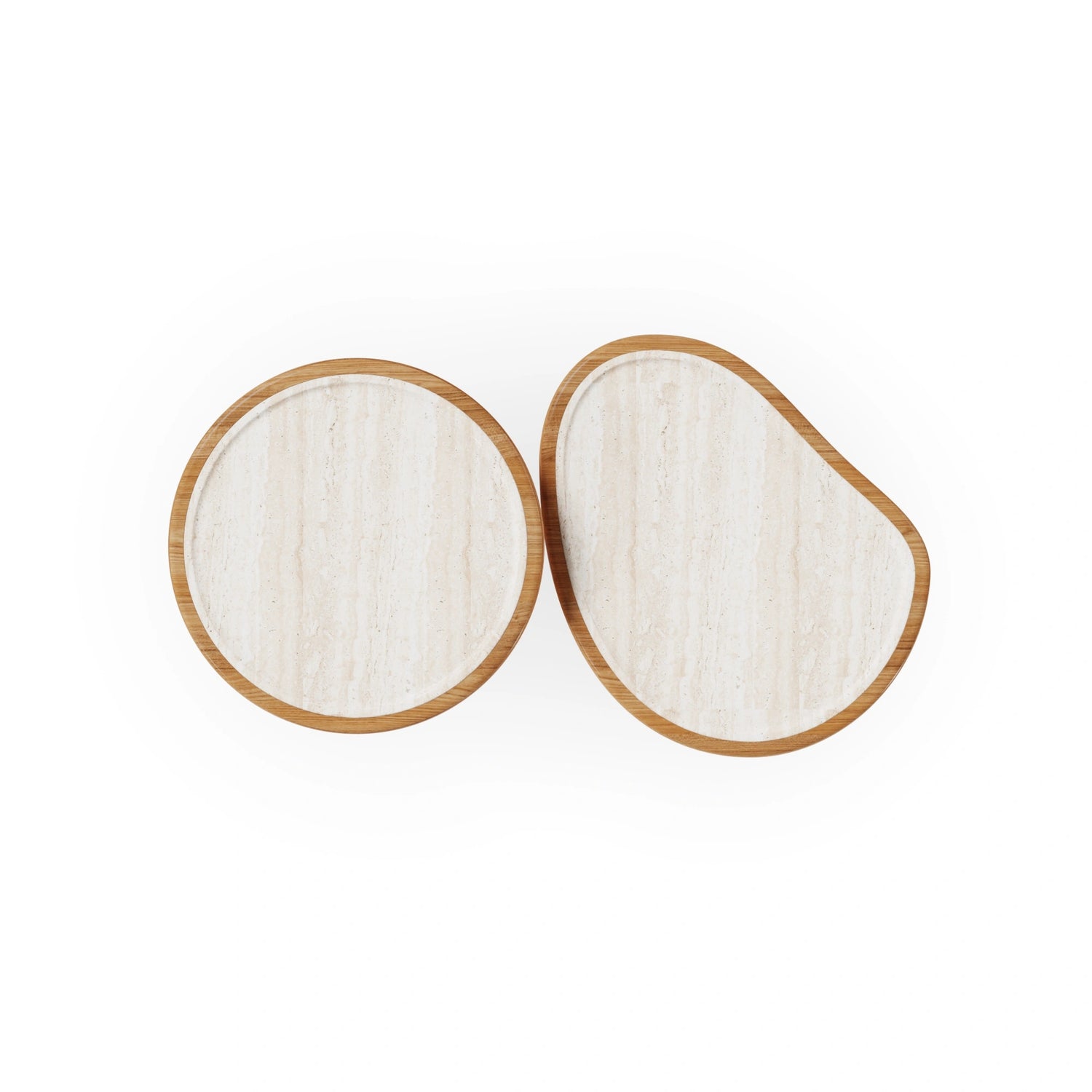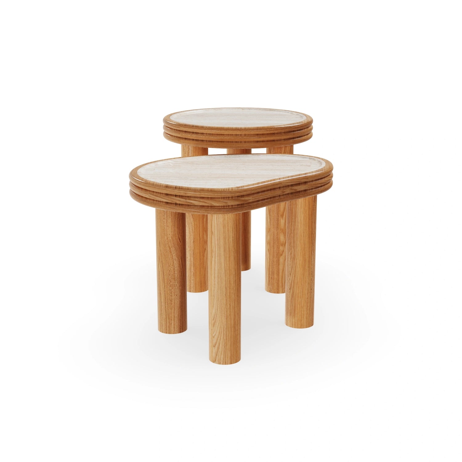 The Lagos Modular Side Table embodies the serene essence of Mediterranean living. Handcrafted from light-toned Iroko wood, its organic silhouette and soft curves evoke the tranquil rhythm of coastal landscapes. The tabletop, sculpted in natural travertine stone, adds a refined texture that mirrors the region’s warm, sunlit tones. Designed as a modular pair, each table can stand alone or nest together in perfect harmony, creating fluid compositions that adapt to any outdoor space. A timeless statement of balance and beauty — where craftsmanship meets the calm of Mediterranean simplicity.
