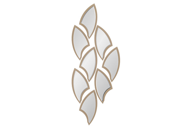A visually captivating wall mirror by Modenese Luxury Furniture featuring a cluster of leaf-shaped reflective panels framed in a warm golden finish. This artistic piece adds texture and dimension, perfect for creating a focal point in living rooms or entryways. Its nature-inspired design seamlessly combines function with art.