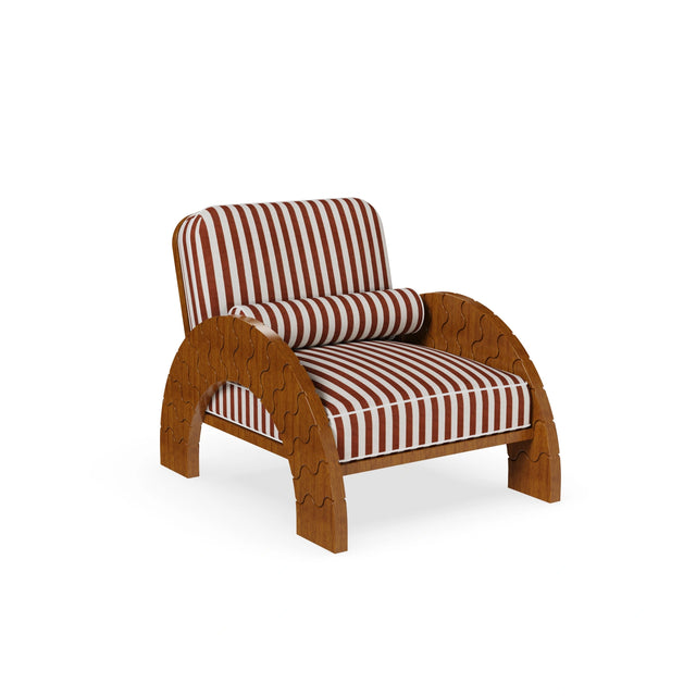 The Luna Armchair by Mediterrazza embodies the essence of outdoor luxury furniture, handcrafted in rich iroko wood with sculptural arms inspired by the curves of a Mediterranean sunset. Its back is wrapped in durable synthetic leather, while the plush seat and back cushions, dressed in an elegant striped fabric, ensure lasting comfort and refined style. Perfect for terraces, gardens, and poolside retreats, Luna blends artisanal craftsmanship with Mediterranean sophistication.