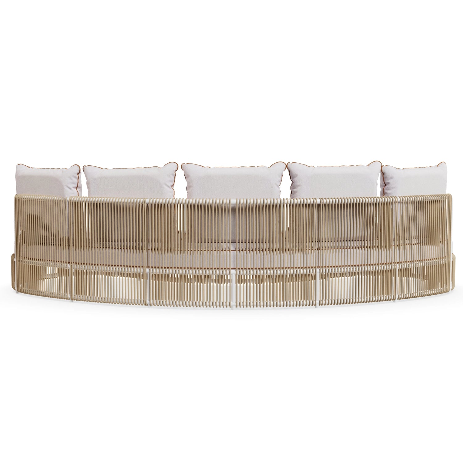 The Menton Sofa embodies the refined essence of luxury outdoor design, blending craftsmanship and contemporary fluidity. Handcrafted in Portugal from lacquered metal, its soft, sculptural silhouette is accentuated by a woven cord backrest that adds both texture and depth. The piped seat detailing reflects Mediterrazza’s devotion to precision and artisanal quality, enhancing its elegant curves and organic flow. Designed for sophisticated outdoor living, the Menton Sofa combines durability with a serene Mediterranean aesthetic — a timeless piece where comfort, artistry, and meticulous design coexist in perfect harmony.
