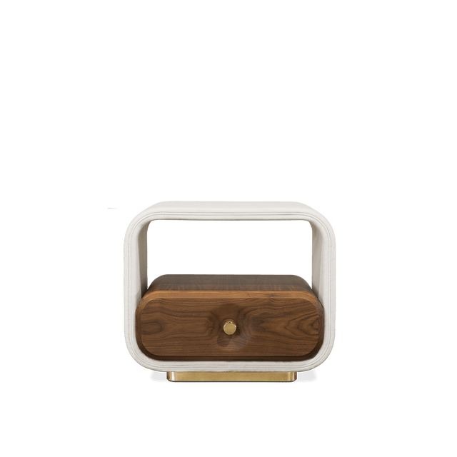 The curvy wood frame upholstered with textured cloth and supported by a polished metal base make this piece stand out for its simplicity and beauty. It contains a single drawer at the bottom, leaving half of the frame empty, which is very stylish and gives it a light presence and a sense of openness that is ideal for extra storage as well.