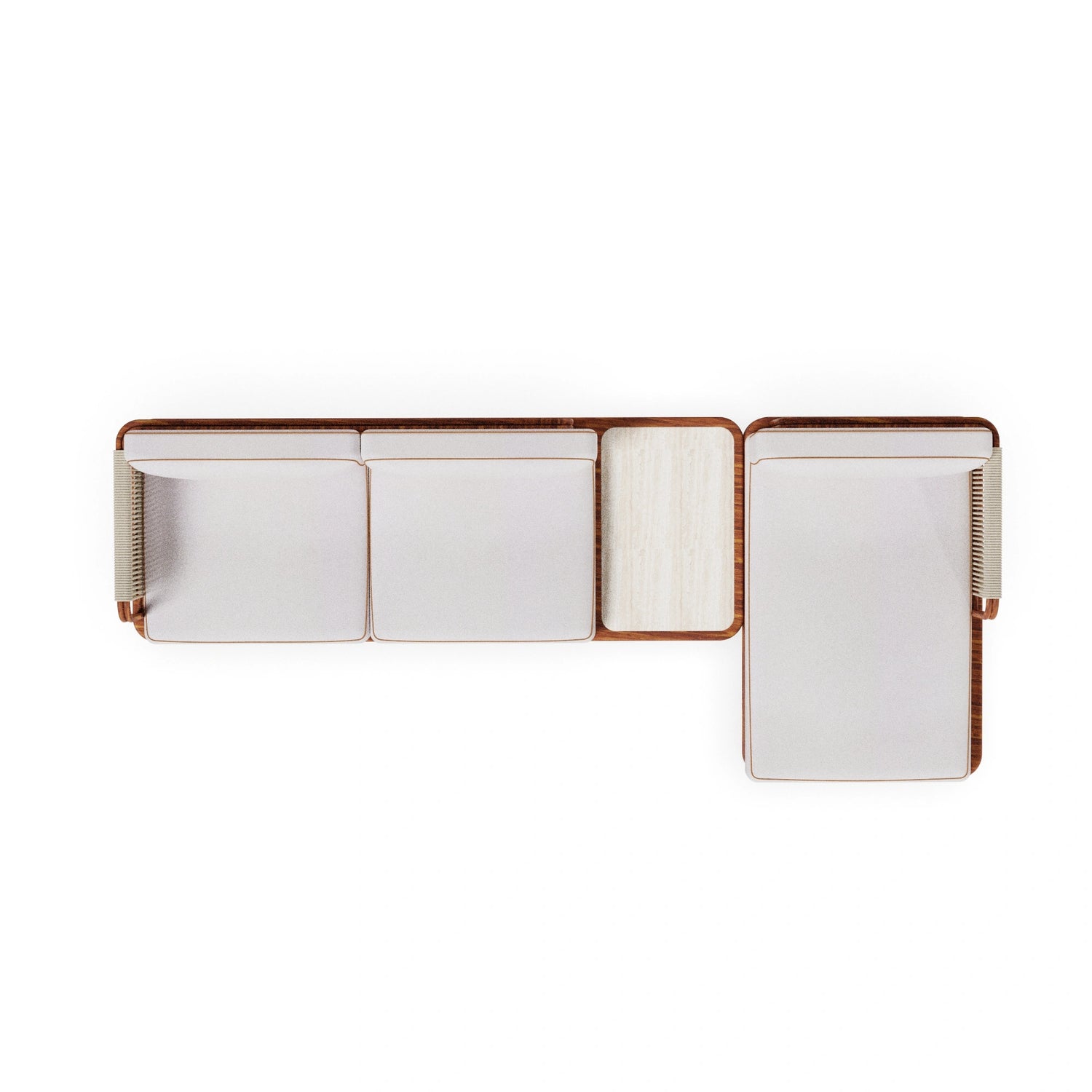 The Moraira Modular Sofa by Mediterrazza is a bohemian-inspired masterpiece of outdoor luxury furniture, handcrafted in iroko wood with elegant synthetic cord details on the back and arms. Its soft seat and back cushions ensure superior comfort, while the integrated travertine table adds natural refinement and functionality. Featuring a versatile chaise longue, Moraira allows for playful modular combinations, adapting seamlessly to residential terraces and hospitality projects. A perfect blend of artisanal craftsmanship, Mediterranean charm, and timeless design.