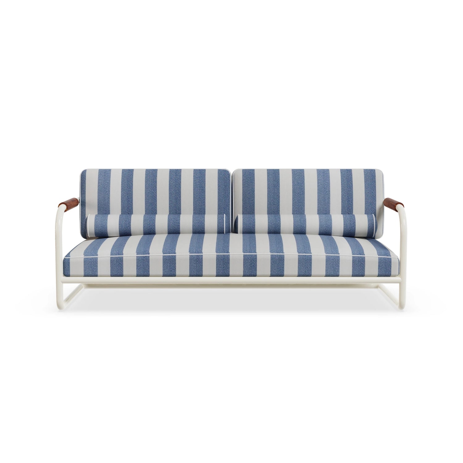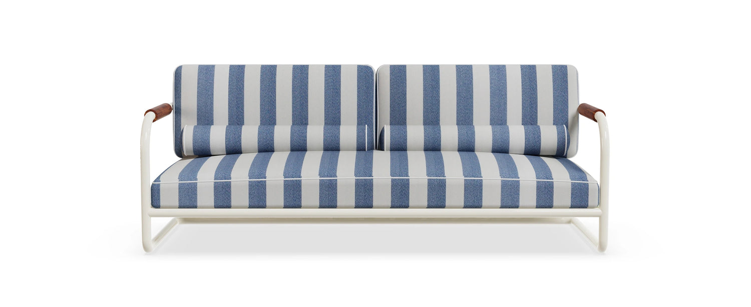 The Mougins Sofa embodies Mediterranean elegance with a modern twist. Hand-crafted in lacquered metal, this piece is built to withstand outdoor living while showcasing refined design. Its carefully detailed back features subtle iroko wood accents, adding warmth and natural texture. Upholstered in striped fabric, the sofa offers generous depth and height for unmatched comfort, complemented by cylindrical cushions for a timeless coastal aesthetic.