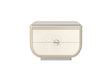 A refined cream nightstand by Modenese Luxury Furniture featuring intricate ornamental carvings on the drawer fronts and a soft rounded shape. Its glossy finish and compact size make it a perfect blend of elegance and practicality.