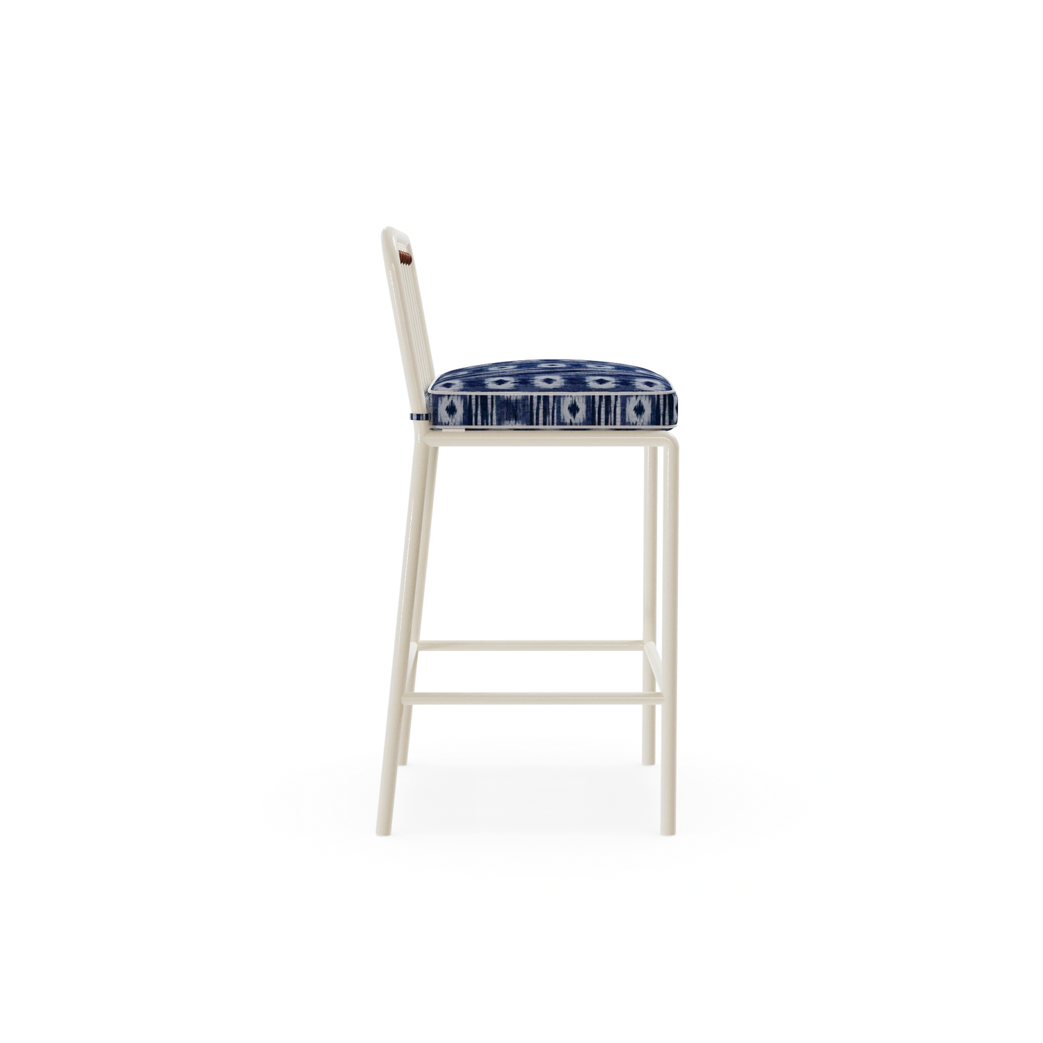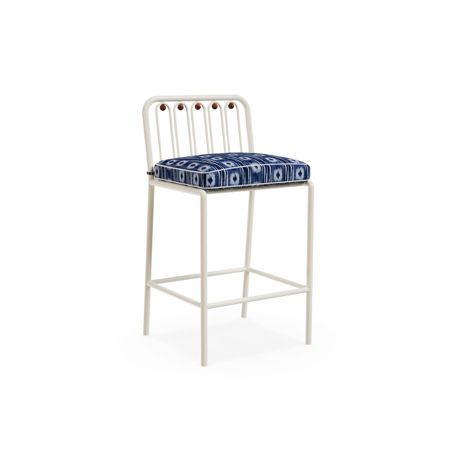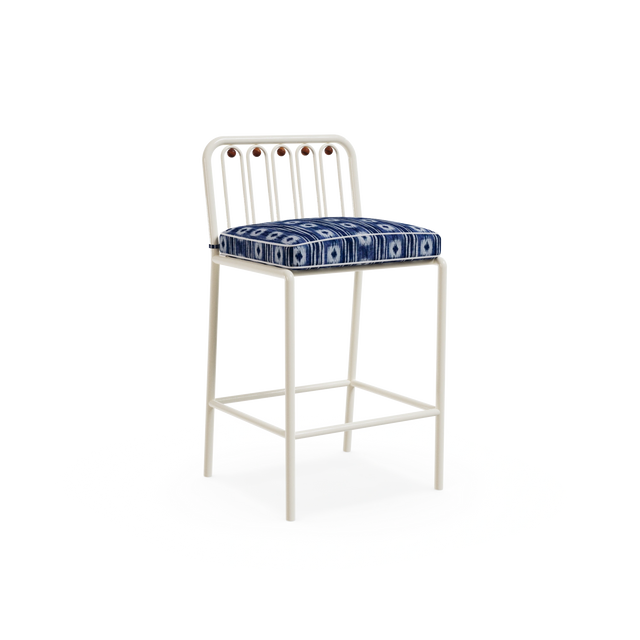 The Ostuni Bar Chair captures Mediterranean charm with a contemporary touch. Crafted in lacquered metal suitable for outdoor use, it features subtle iroko wood details that enhance its natural elegance. The seat is upholstered in a decorative Mediterranean patterned fabric, bringing texture and character.