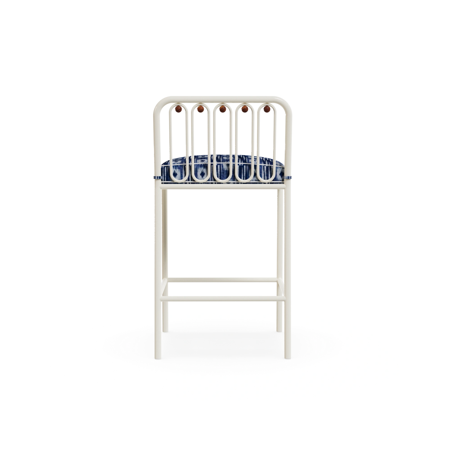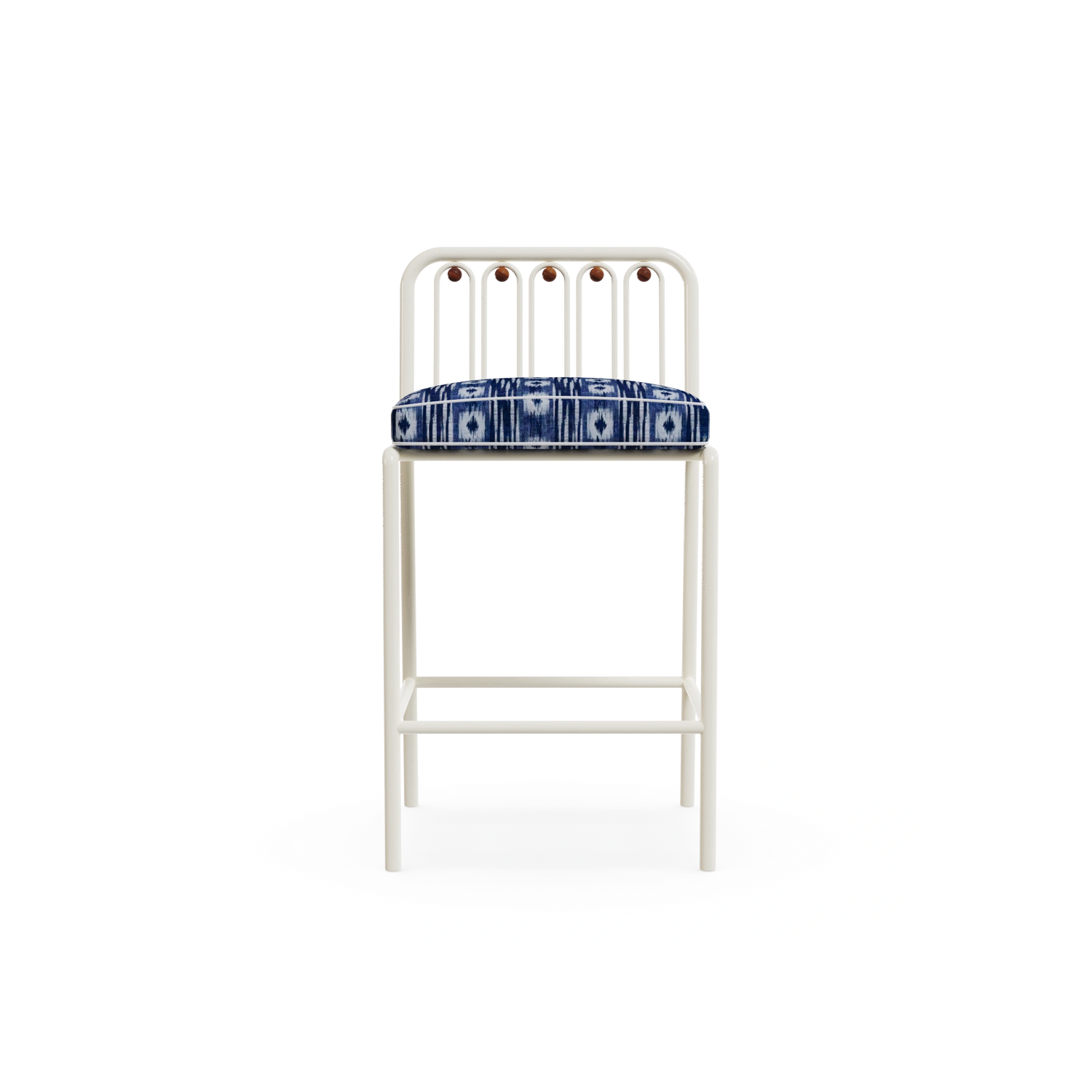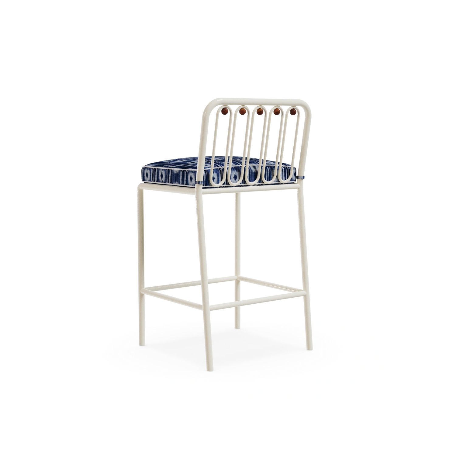 The Ostuni Bar Chair captures Mediterranean charm with a contemporary touch. Crafted in lacquered metal suitable for outdoor use, it features subtle iroko wood details that enhance its natural elegance. The seat is upholstered in a decorative Mediterranean patterned fabric, bringing texture and character.