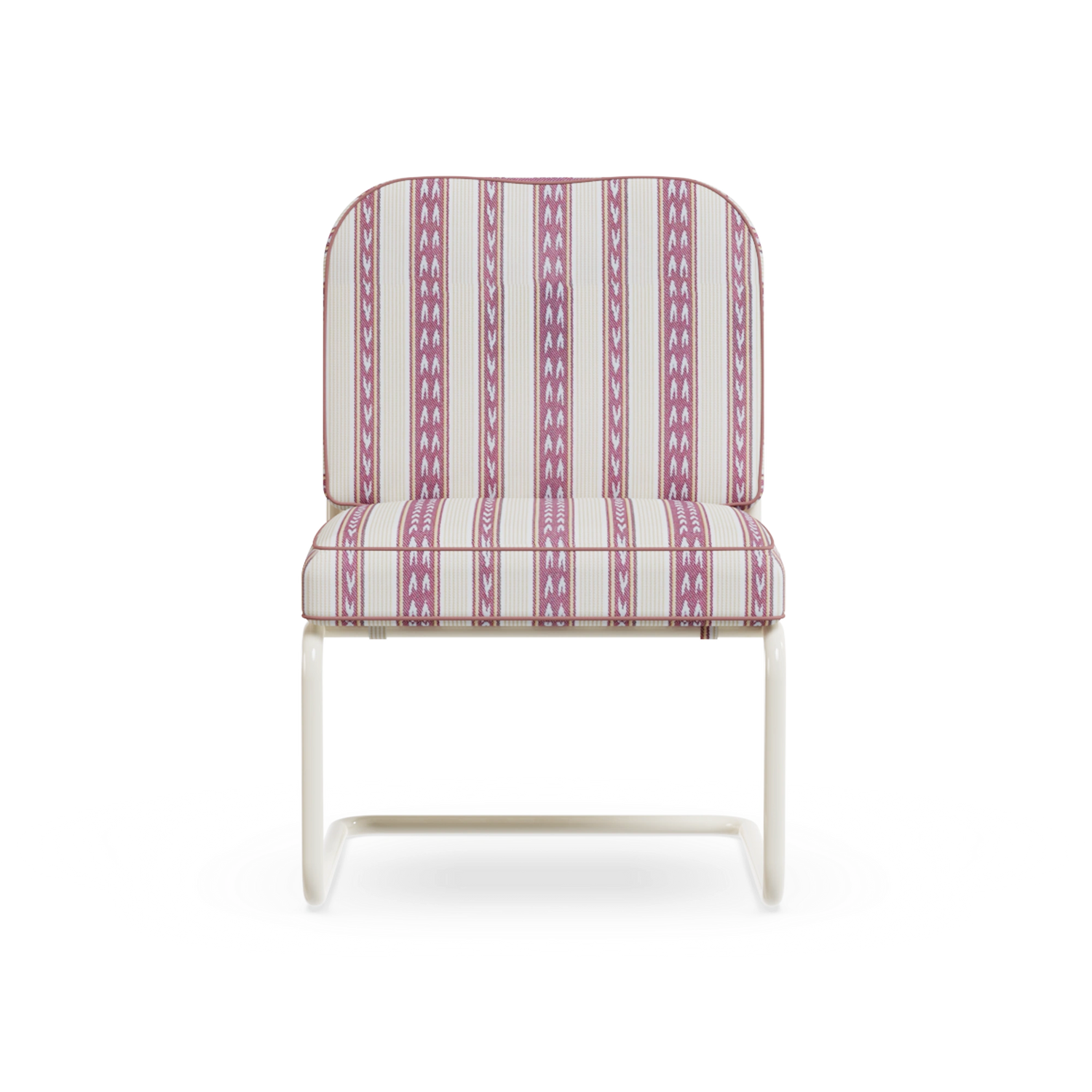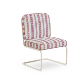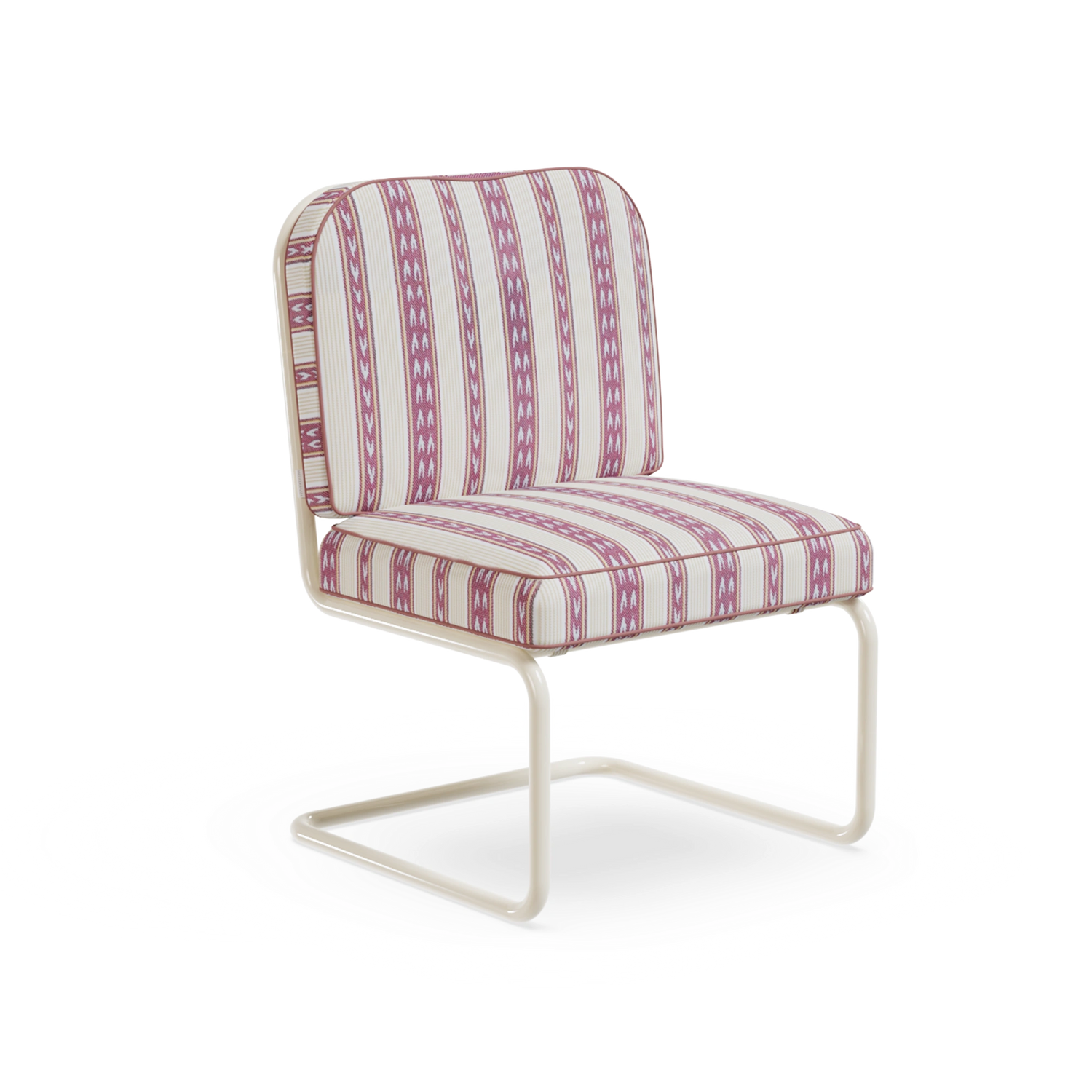 The Ostuni Dining Chair captures Mediterranean charm with a contemporary touch. Crafted in lacquered metal suitable for outdoor use, it features subtle iroko wood details that enhance its natural elegance. The seat is upholstered in a decorative Mediterranean patterned fabric, bringing texture and character.