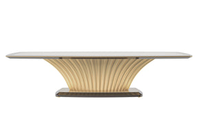 A statement-making dining table by Modenese Luxury Furniture featuring a fluted golden base that elegantly fans out to support the rectangular top. The glossy finish and sophisticated design make it a luxurious centerpiece for formal dining areas.