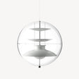 A decorative pendant featuring a crystal clear transparent acrylic outer sphere with four white reflectors suspended by three steel chains. the white is only abrupted by a little splash of red only visible from below the pendant. A classic Panton touch.