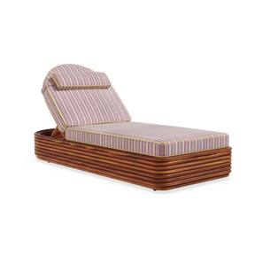 The Paros Sun Lounger is a true statement of outdoor luxury furniture, hand-crafted in iroko wood for durability and timeless beauty. Its ribbed base with a bohemian feel and decorative arched backrest bring an artisanal touch to outdoor living spaces. The striped Mediterranean pattern of the cushions, enhanced with refined piping, ensures both comfort and elegance. With an adjustable backrest for the perfect inclination, Paros is designed to combine relaxation with elevated design, making it ideal for both residential and hospitality projects.