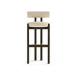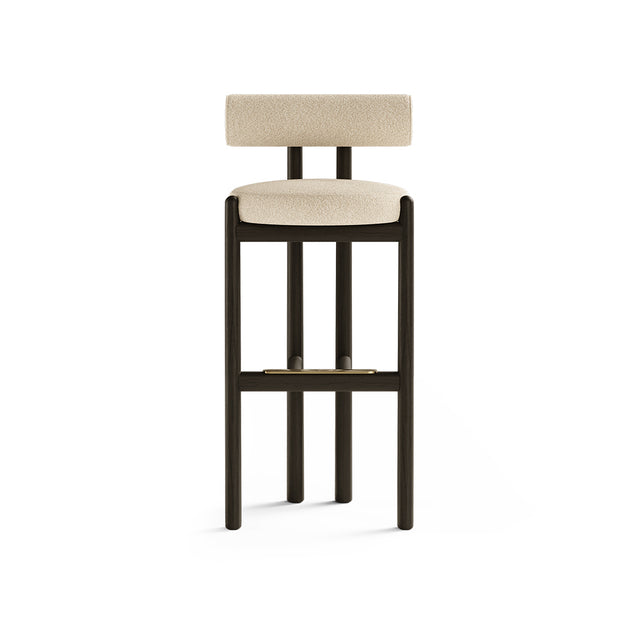 The Petra Bar Chair features four wooden legs arranged in an asymmetrical design, offering a visually intriguing yet stable foundation that highlights the natural beauty of the wood. The seat has a round, upholstered base, providing a plush and inviting surface, while the cylindrical backrest adds ergonomic support with a sleek, modern profile.