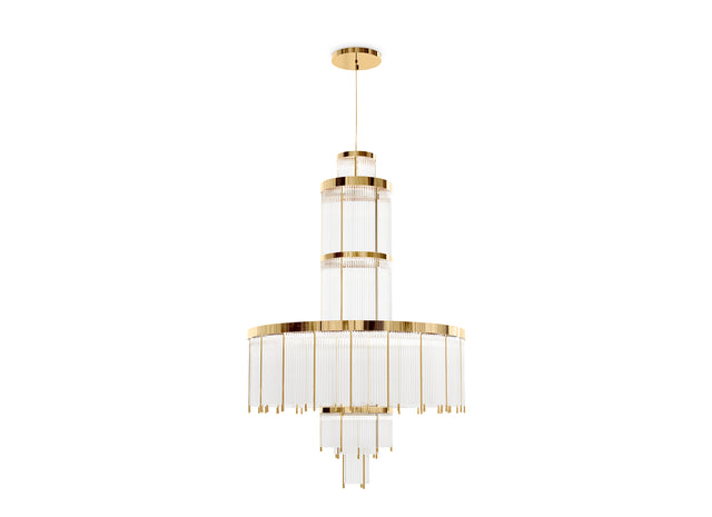 Inspired by the imponent and robust structure of Lighthouses, the Pharo Chandelier represents the rupture of the darkness with an immense and luxurious shine. Made with gold-plated brass and crystal glass, this luxury modern chandelier is the perfect solution for wide spaces, and it’s able to swipe every eye in the room.