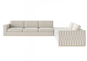 This contemporary sectional sofa by Modenese Luxury Furniture combines comfort and style with a modern design featuring quilted accents along the base. The sleek lines and neutral tones create a minimalist yet luxurious look, making it a perfect fit for large living areas that demand both practicality and elegance.