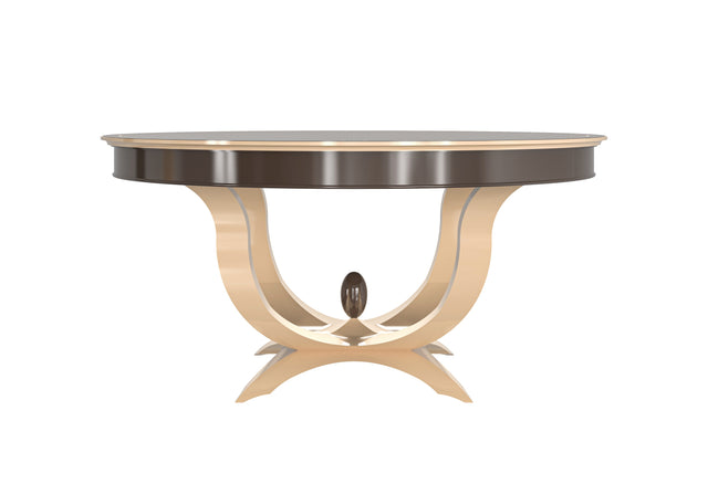 A refined round dining table by Modenese Luxury Furniture featuring a glossy dark top and a gracefully curved golden base. The central design includes an elegant decorative element, making this table a perfect blend of style and functionality for luxurious dining spaces.